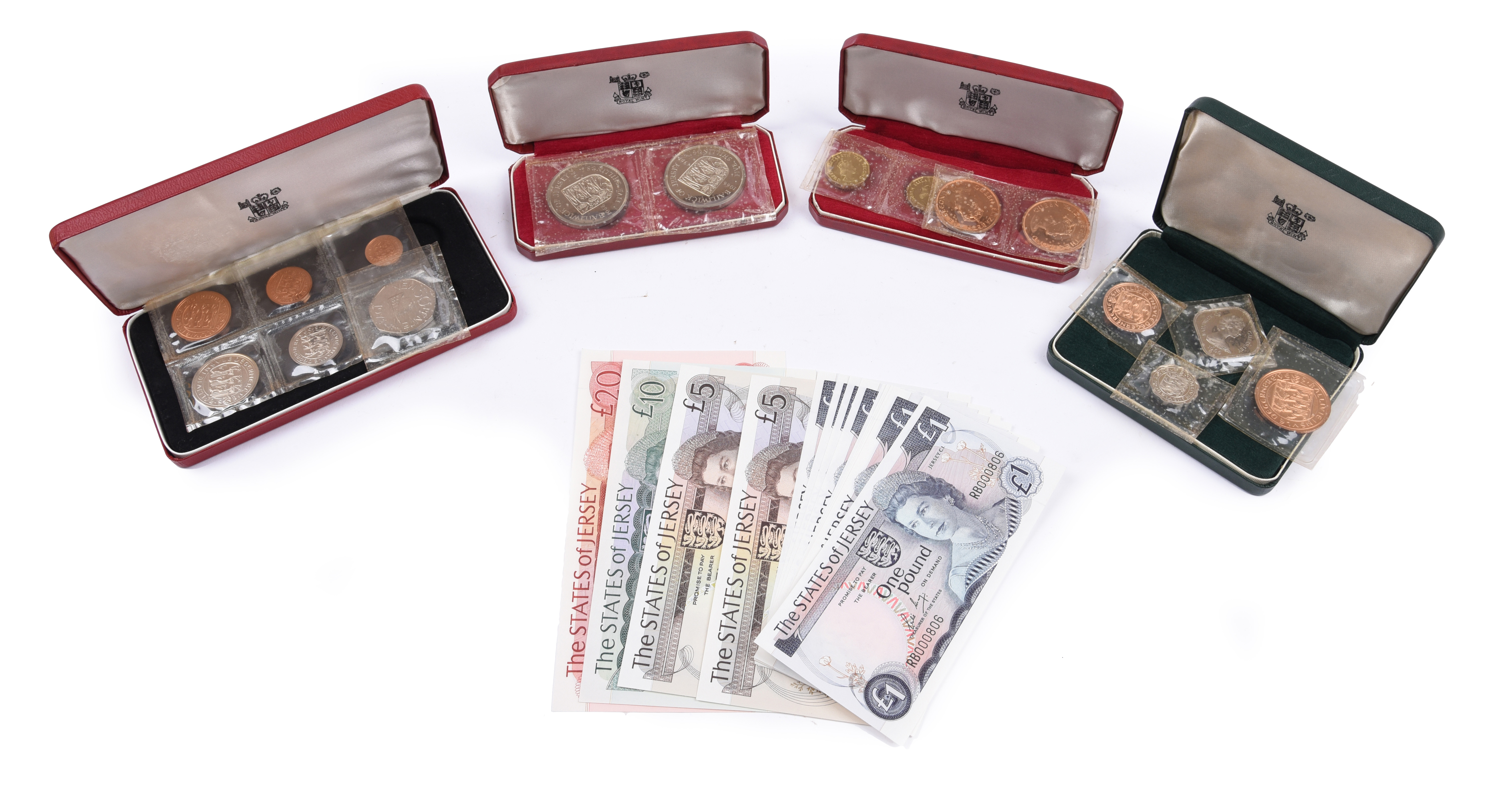 States of Jersey: Elizabeth II, banknotes: one pound (10), serial numbers RB000806 to RB000810 consecutive, and RB000816 to RB000820 consecutive; five pounds, HB999265 and HB999266; ten pounds, FB929601; and twenty pounds, AC051701, uncirculated; together with a small quantity of base metal proof coin sets, cased. [qty]
