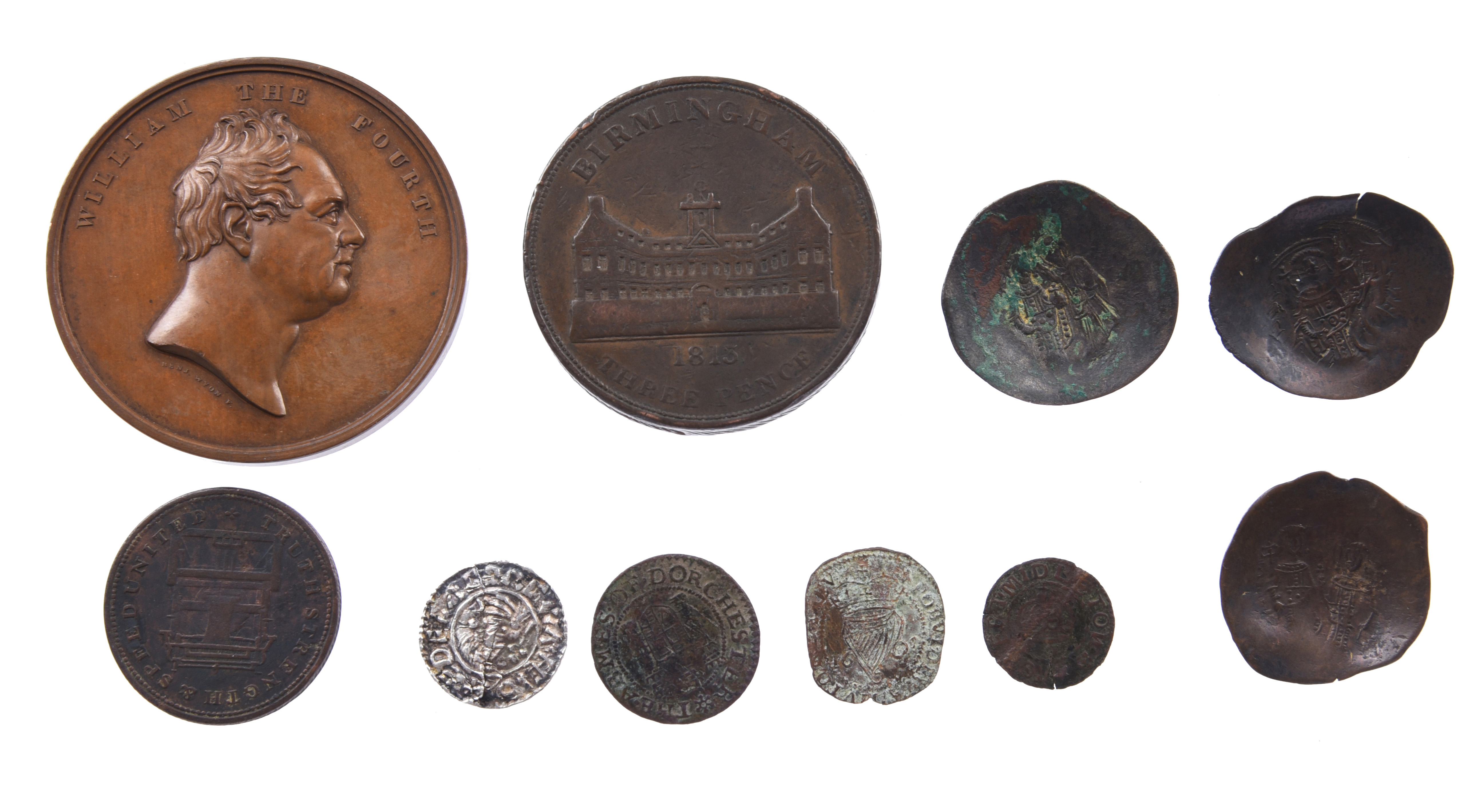 A small collection of coins and other numismatic items, various regions and periods, including: England, Aethelred II (978-1016), silver penny, fair; Byzantine Empire: copper scyphate coins (3), fine; Ireland, Elizabeth I, copper penny 1602 (S 6510A), clipped and tarnished, near fine; various examples of English token coinage; commemorative medals including: William IV, London Bridge Opened 1831, copper (E 1245), good very fine; and other items. [qty]