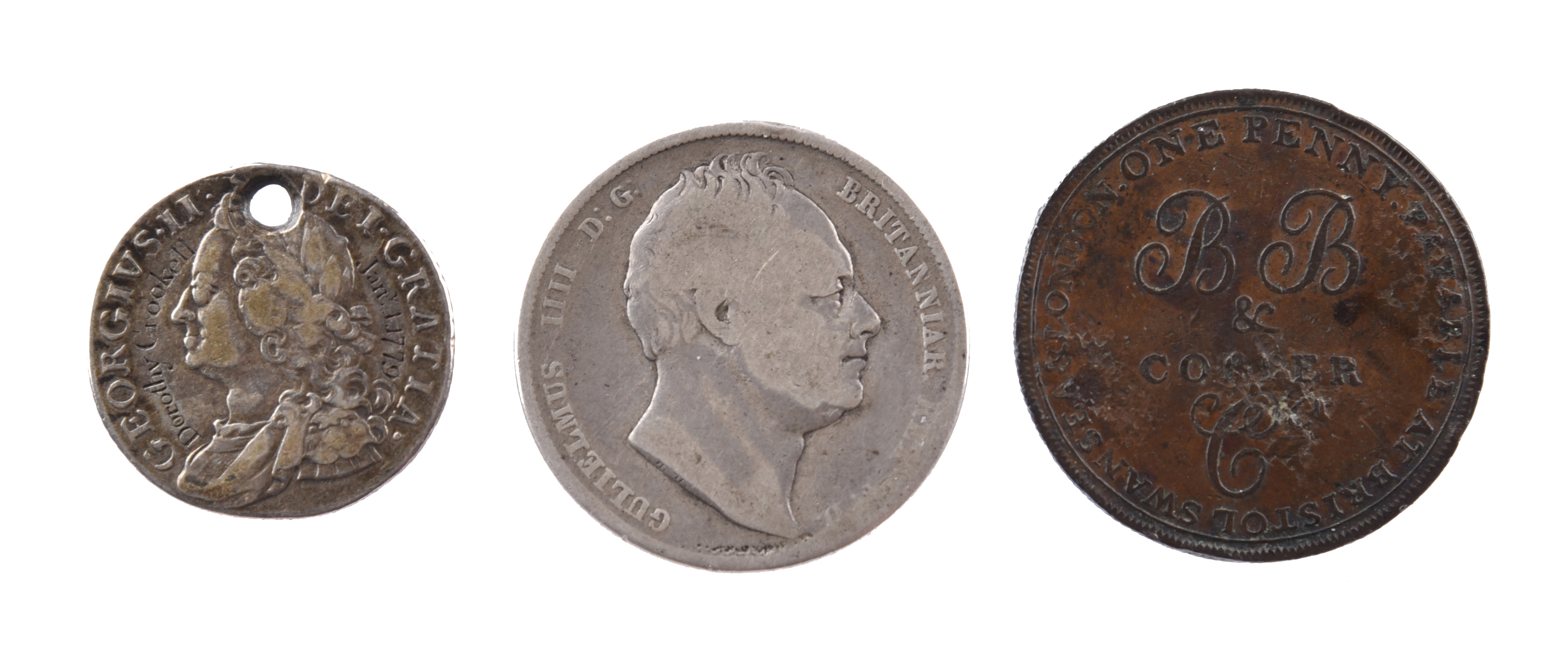 A quantity of coins, including: William IV, silver half crown, 1836, near fine; a personal token made from a silver shilling of George II, 1758, obverse field engraved "Dorothy Crookell Jany 1. 1779"; a copper token penny, Bristol 1811; and other items. [qty]