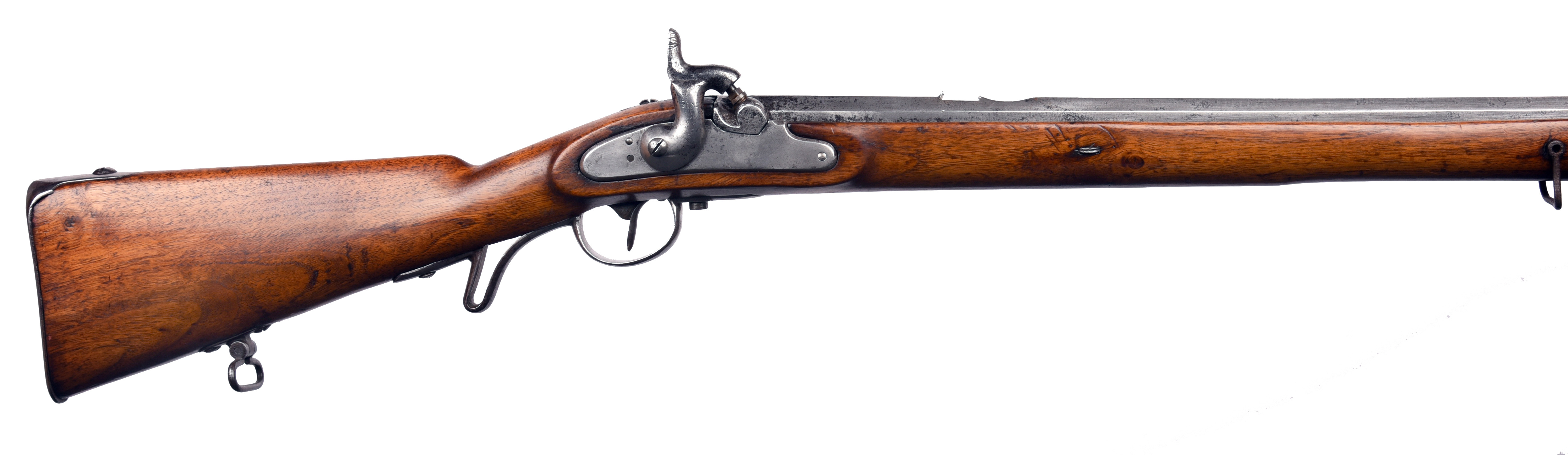 An Austrian M1854A Lorenz short rifle (Jaeger Schuetzen), two-stage barrel 27.5 in., octagonal to within 4.25 in. of the muzzle and round thereafter, lacking articulated part of back sight but retaining fixed sight and marked with graduations from 100 to 400 yards; percussion lock; stocked for the length of the octagonal stage of the barrel with steel furniture, trigger guard with finger rest, steel ram rod.