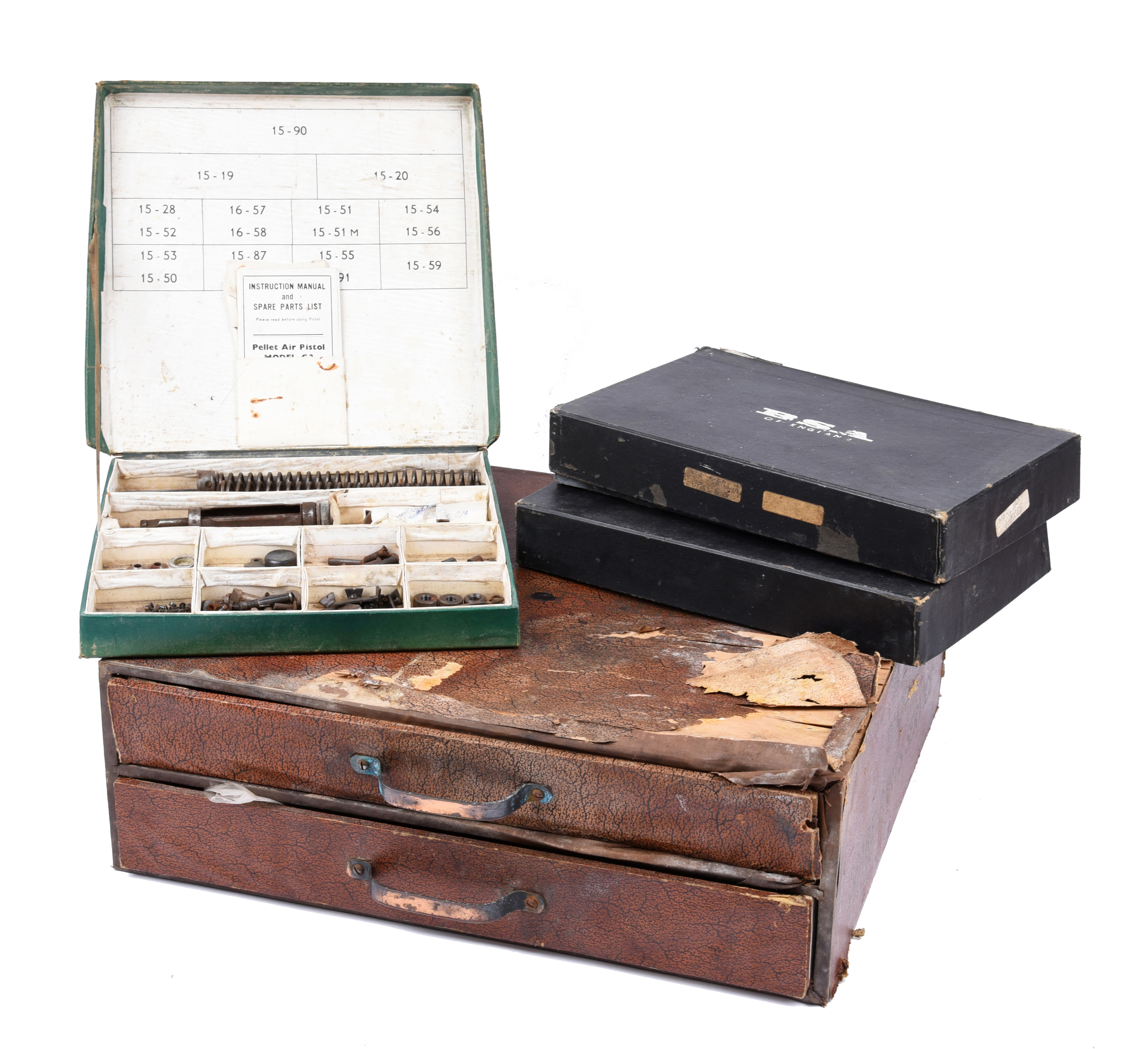 A collection of scarce airgun trade spares boxes, comprising: a two drawer Diana case with some contents including springs, a Diana spares box with some contents, a B.S.A. box with some contents (mainly Merlin A2 rifle spares), and another B.S.A. box with some contents (mainly Airsporter and Scorpion pistol spares).
