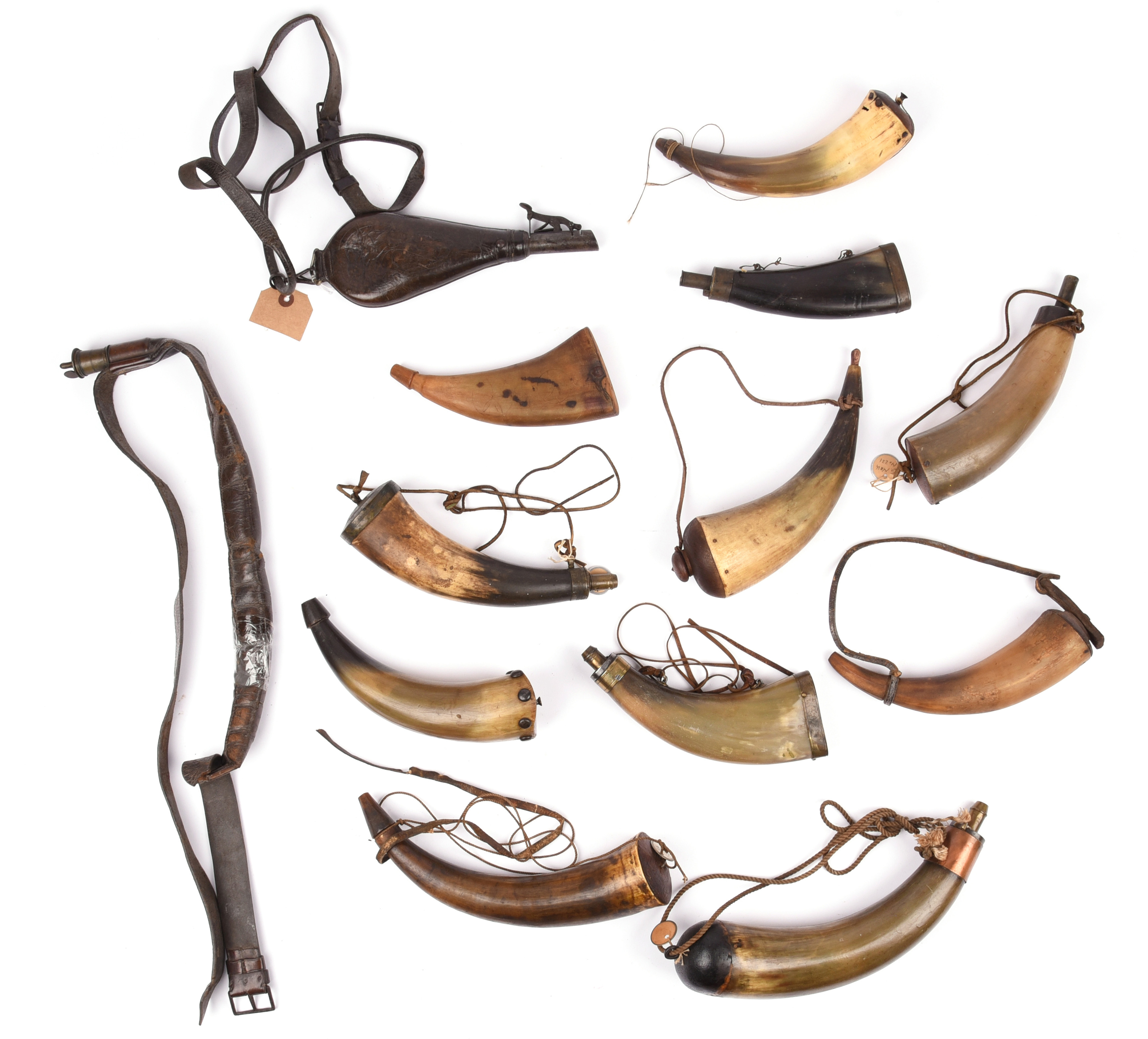 A leather shot belt, a leather bodied shot flask, and eleven horn powder flasks. [13]