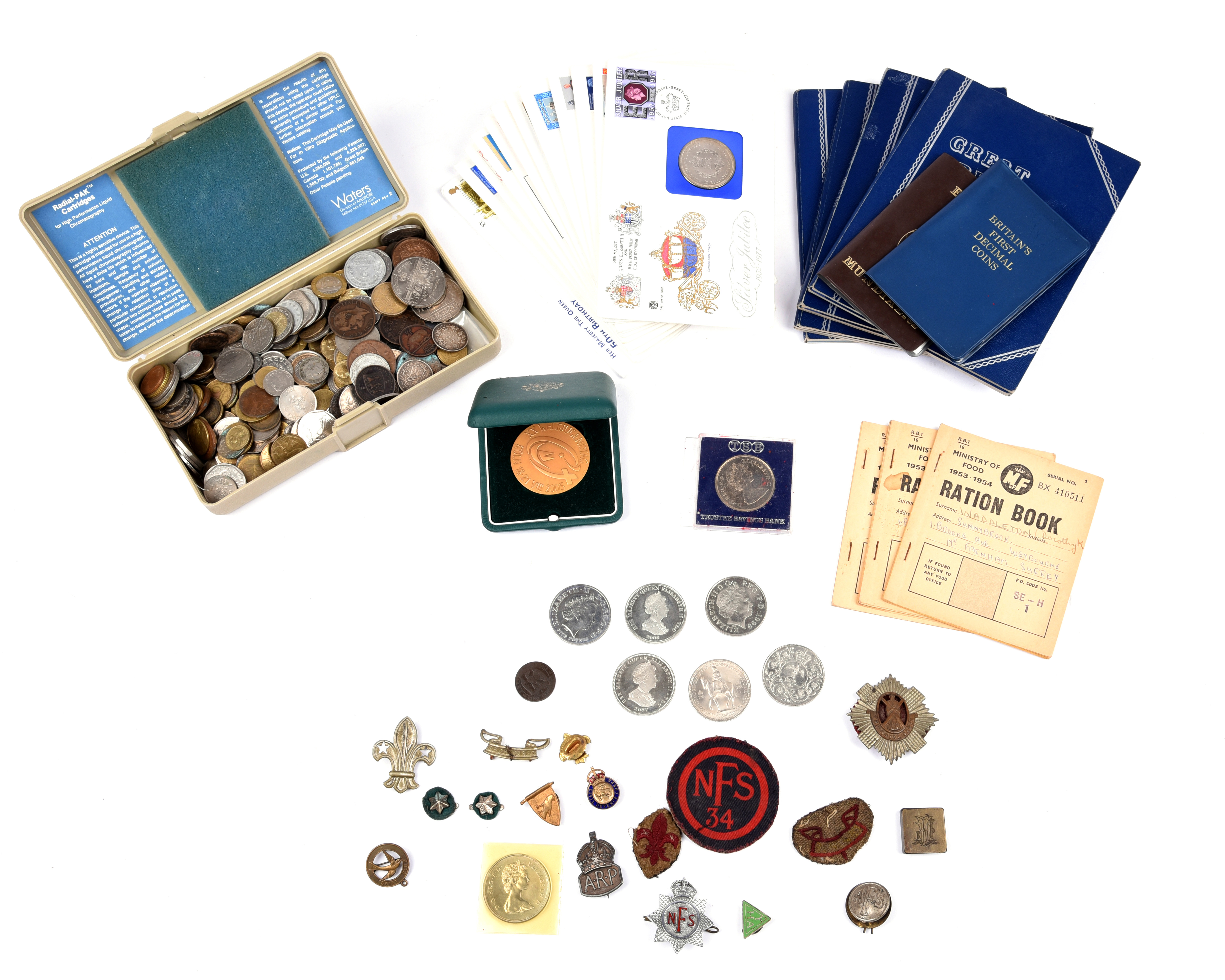 A small quantity of badges, including two silver ARP badges, a Swift Club badge and a Scouting Associate badge; together with a quantity of coins, mainly British 20th century, including commemorative crowns and later pre-decimal issues. [qty]