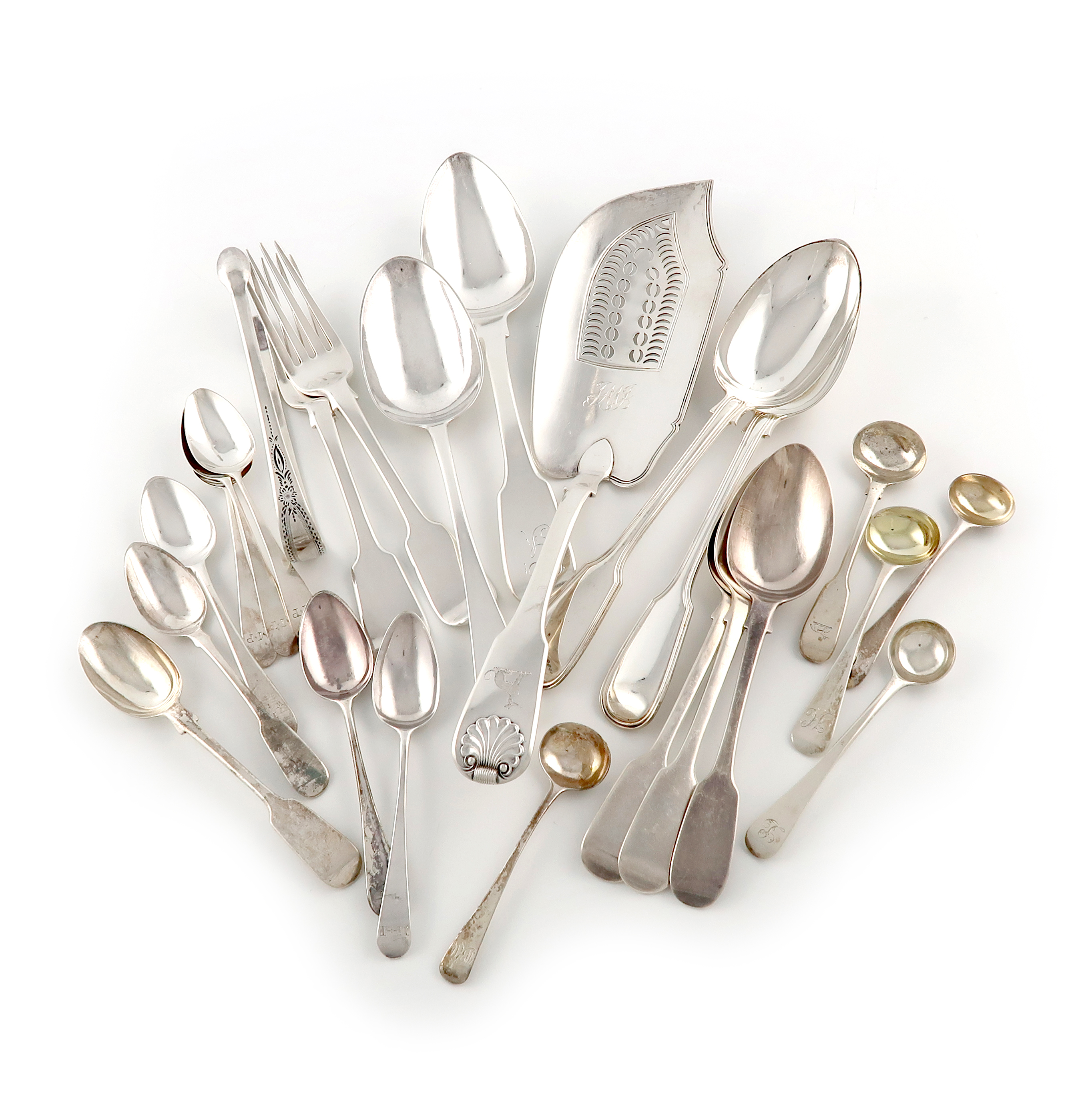 comprising: a George III fish slice, London 1812, two tablespoons, two table forks, three dessert spoons, a pair of sugar tongs, a pair of Fiddle and Thread tablespoons, nine teaspoons and four salt spoons, approx. weight 30.5oz. (qty)