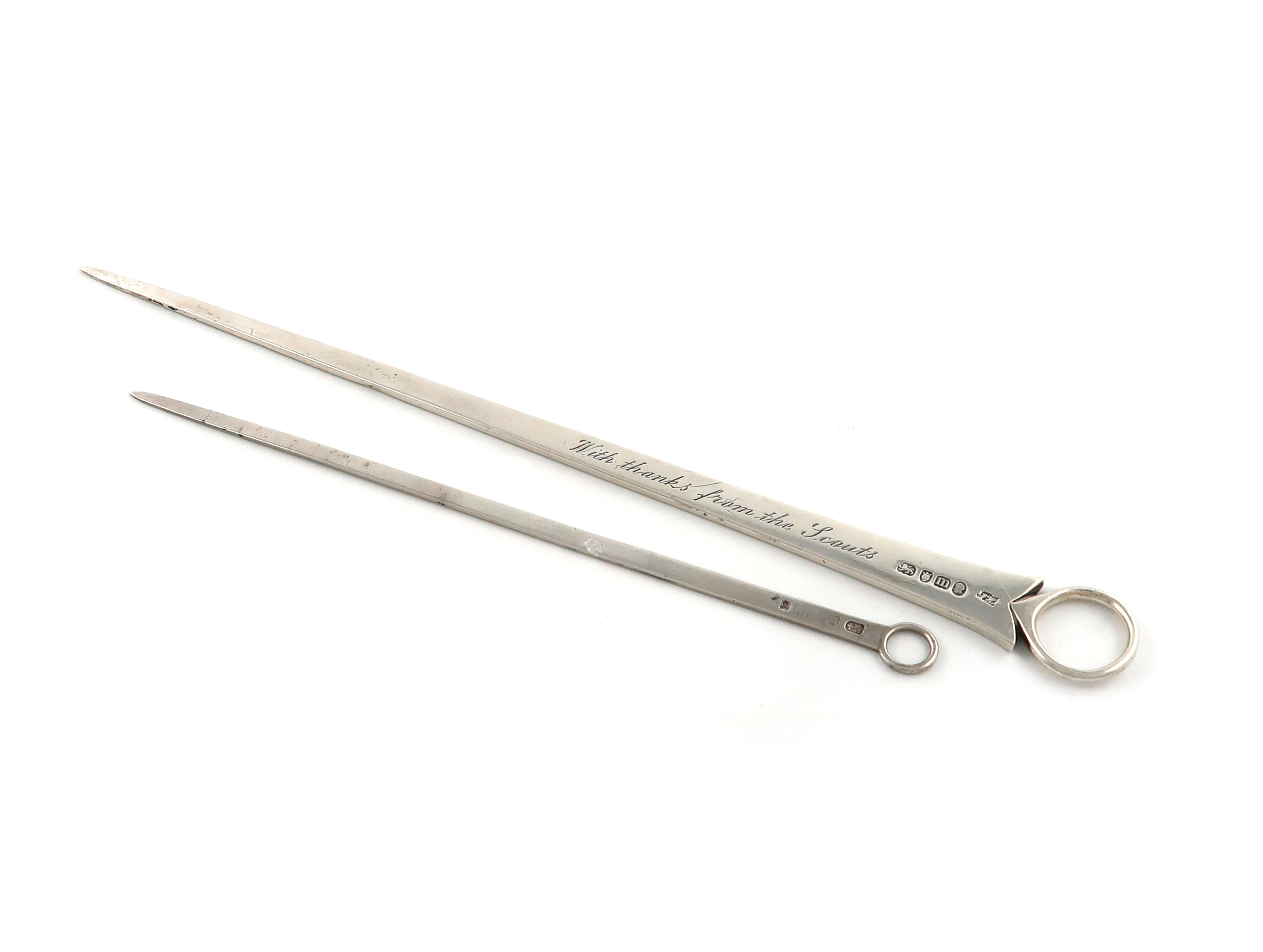 plain tapering form, ring handle, with a later presentation inscription, length 28cm, plus a George III silver poultry skewer, by Wakelin and Taylor, London 1785, plain form, ring handle, approx. total weight 2.6oz. (2)