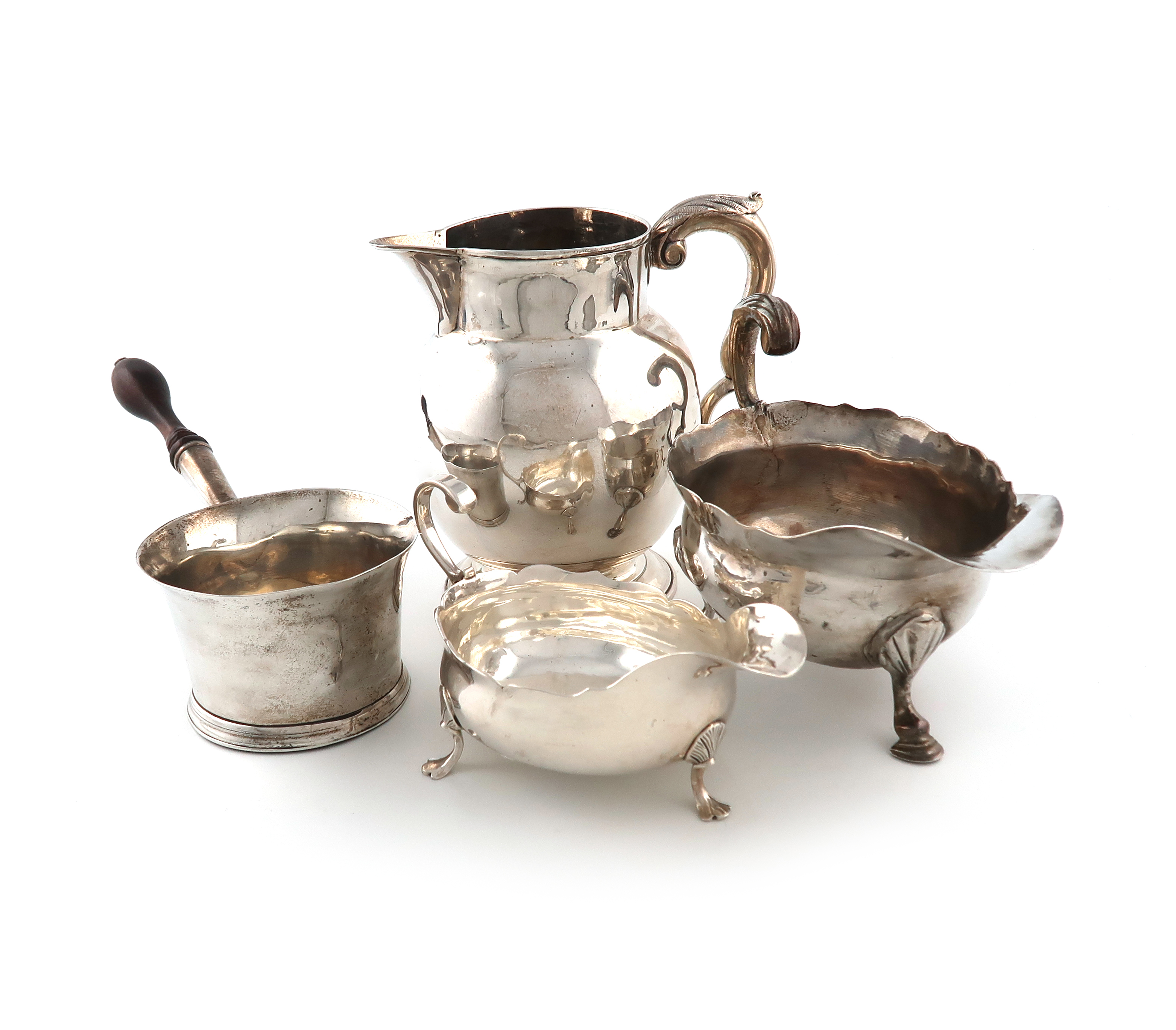 comprising; a George III provincial sauce/cream boat, by John Langlands, Newcastle 1760, oval form, scroll handle, plus another sauce boat, a brandy pan, and a jug with cancelled mugs and London Assay Office marks for London 2003, for .800 standard silver, baluster form, leaf capped scroll handle, on a circular foot, approx. total weight 26oz. (4)