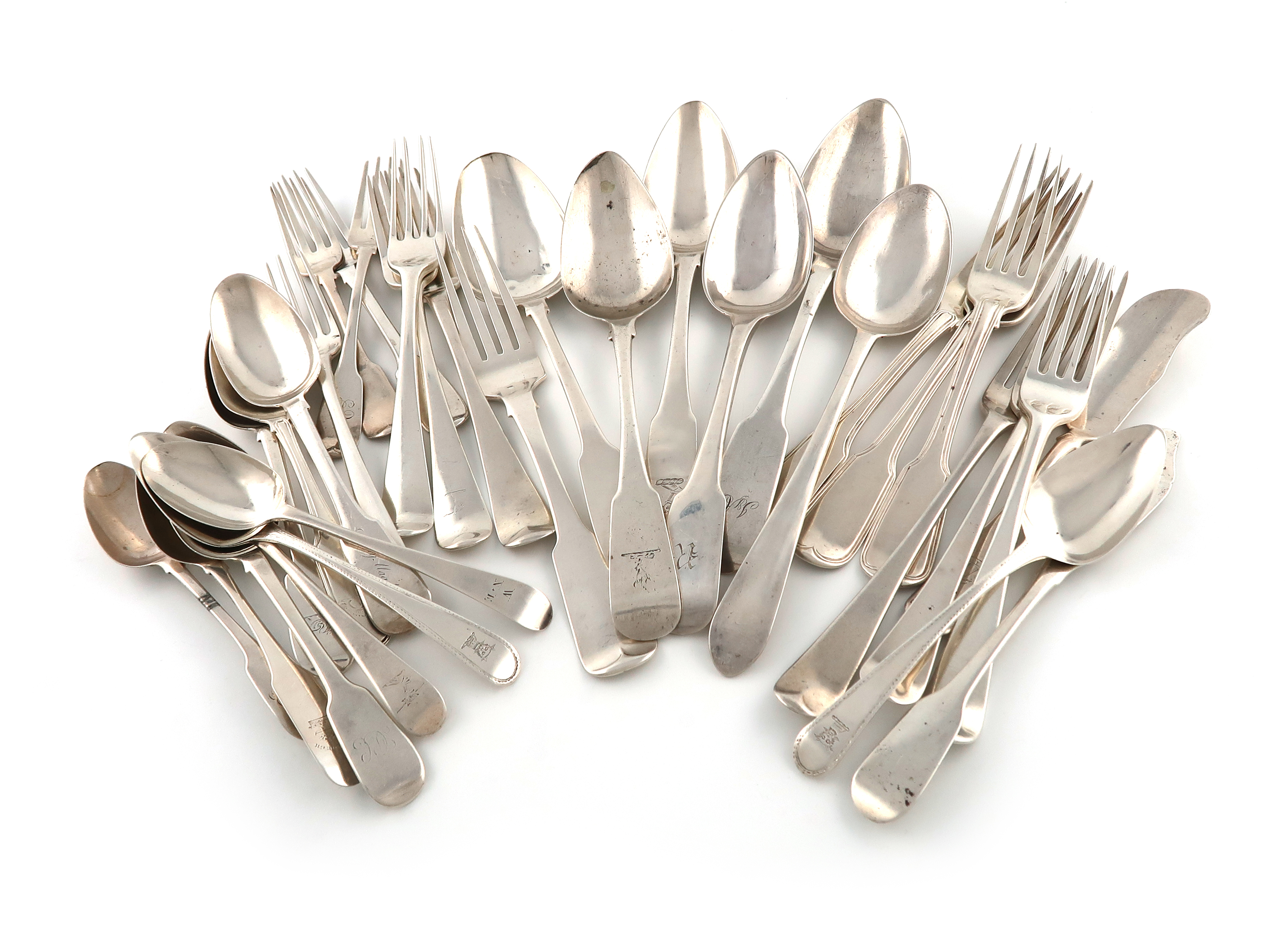 comprising: six tablespoons, eleven table forks, three dessert forks, nine dessert spoon, two butter knives, and a teaspoon, approx. weight 53oz. (qty)