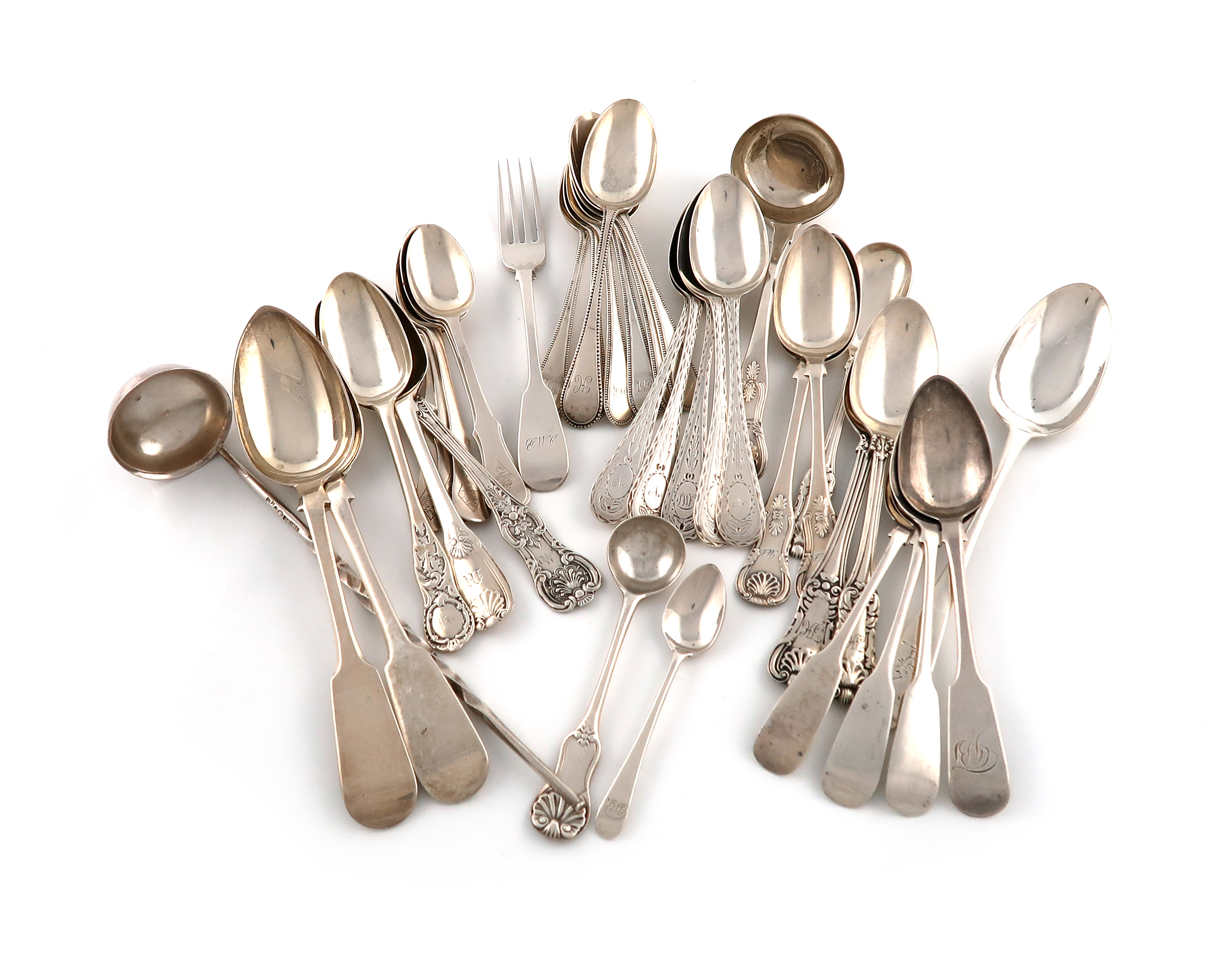 comprising: a toddy ladle, three dessert spoons, another toddy ladle, a set of six teaspoons, twenty-three further spoons, a small fork, two condiment spoons and a miniature spoon, approx. weight 24.5oz. (qty)
