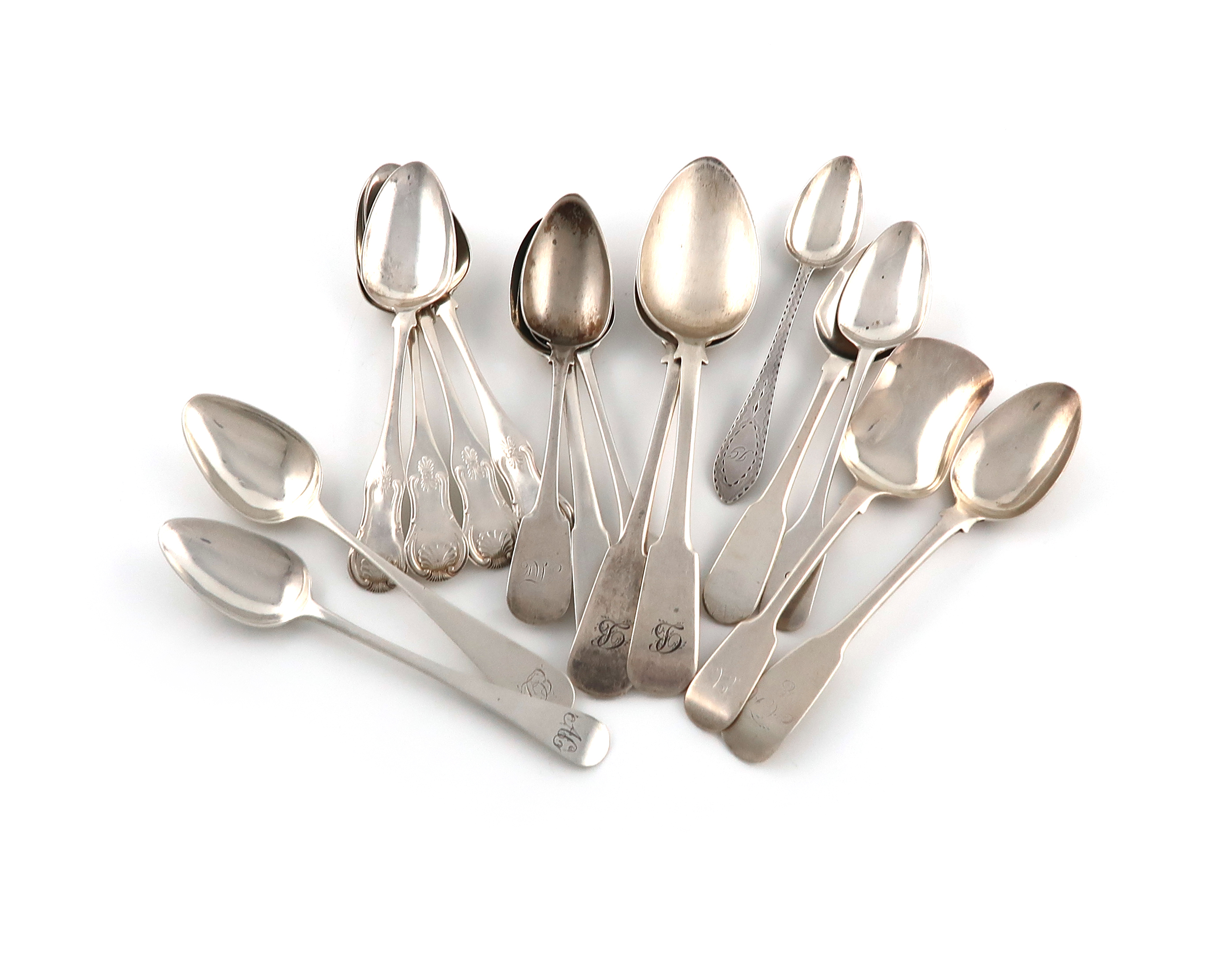 comprising: an Aberdeen sugar spoon, by George Jamieson, with London marks, and Elgin teaspoon, by William Ferguson, an Inverness dessert spoon by Ferguson and MacBean, an Aberdeen dessert spoon, a Dundee teaspoon by Cameron, two teaspoons by William Hannay of Paisley, with Edinburgh marks, a set of four King's pattern teaspoons by Peter Gill of Aberdeen, with Edinburgh marks, a teaspoon by Nathaniel Gillet of Aberdeen, a teaspoon by David Gray of Dumfries, and three other spoons, approx. weight 9.8oz. (qty)