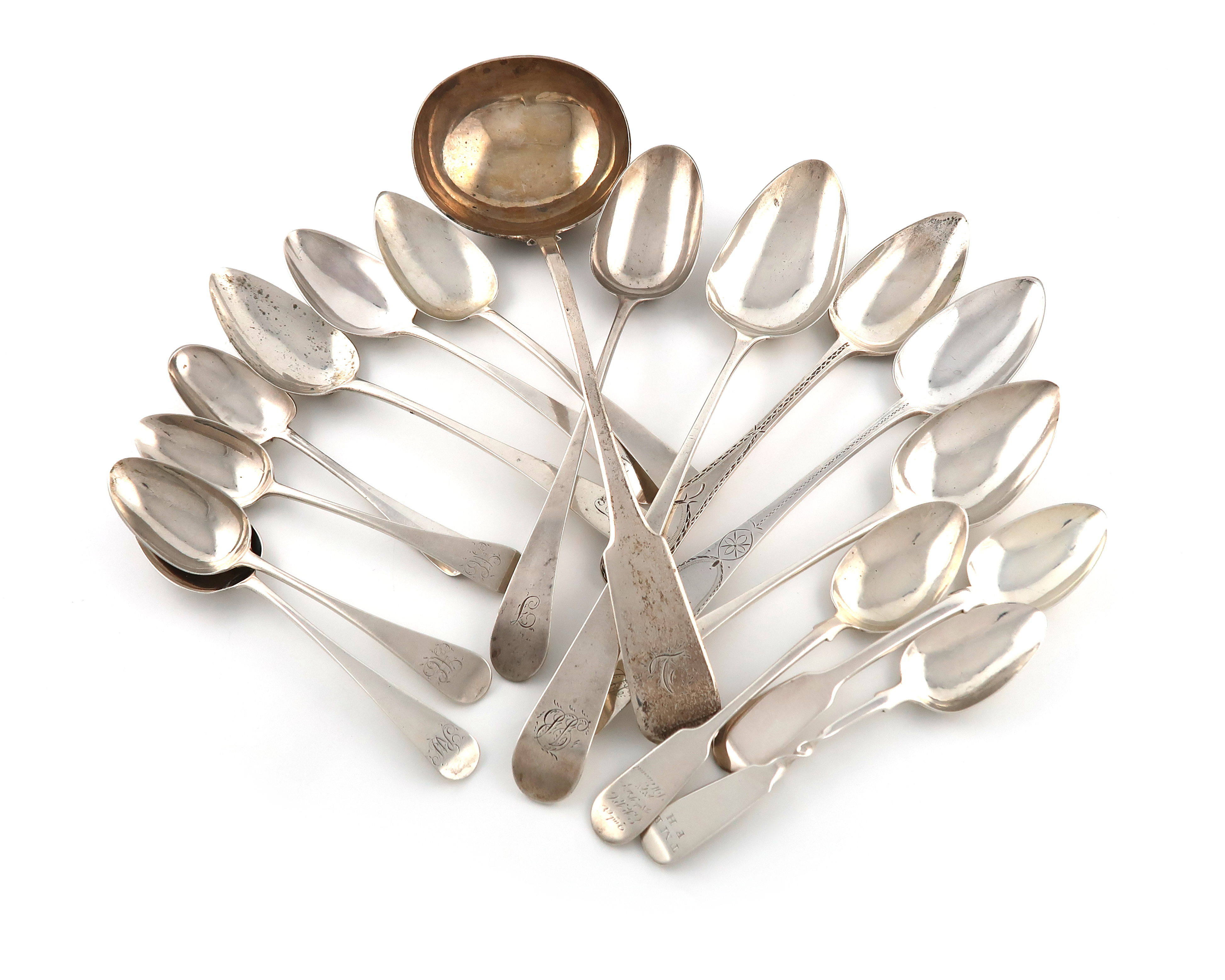 comprising: a soup ladle, by William Welch, 1818, two basting spoons, six tablespoons and seven dessert spoons, approx. weight 28oz. (qty)