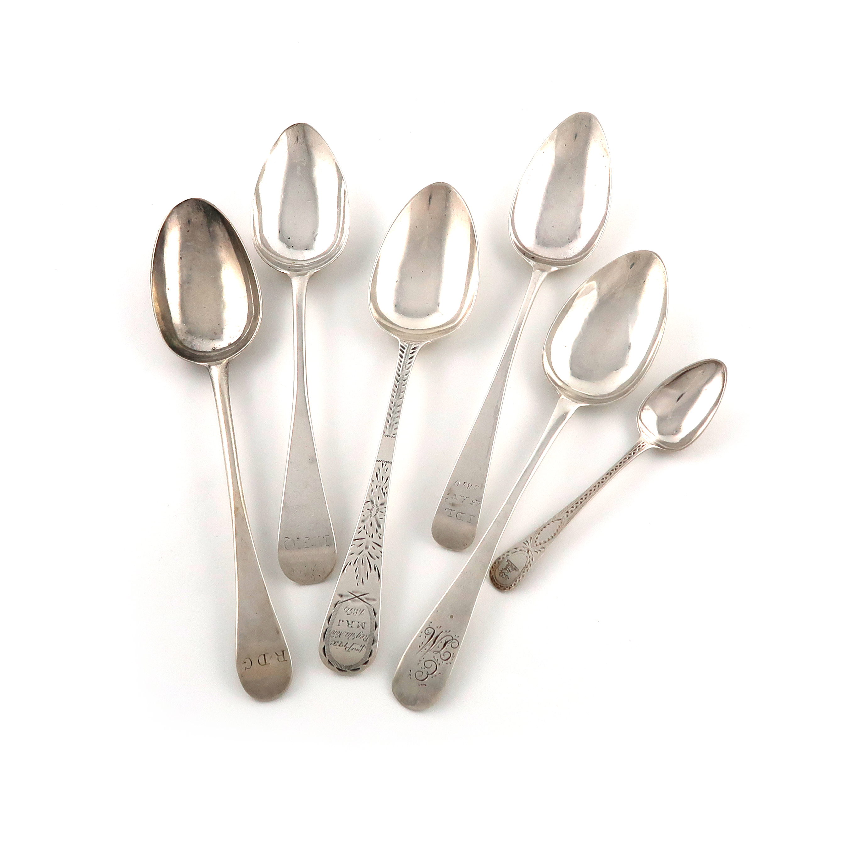 all Jersey, comprising: five tablespoons, by John Le Gallais, Jacques Quesnel, Charles William Quesnel, George Hamon, and one by the maker LC, unidentified, plus a Bright-cut teaspoon by the same maker, approx. weight 7.2oz.