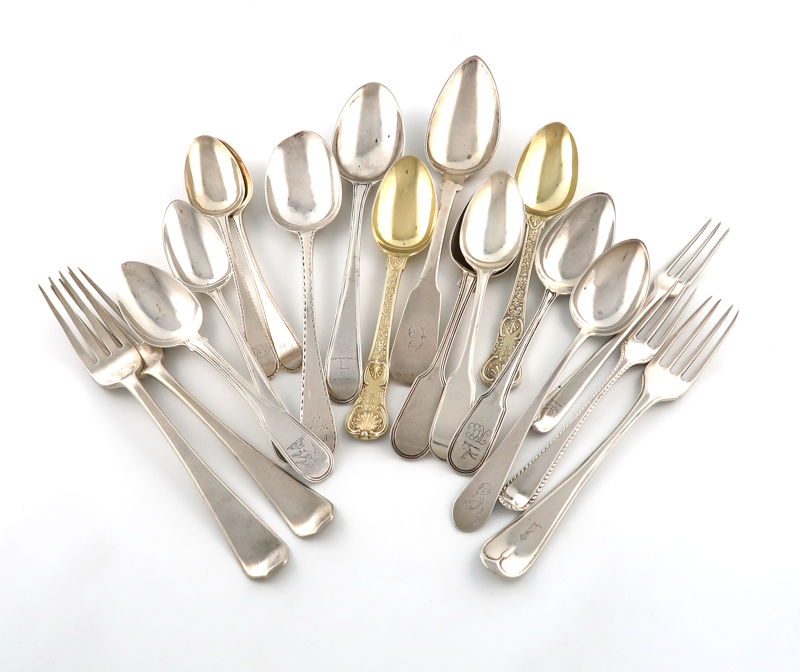 comprising: a George III silver-gilt dessert spoon, by Eley and Fearn, London 1815, King's shape with trailing oak leaves, plus a matching continental spoon, plus three tablespoons, three table forks, eight dessert spoons, and two dessert forks, approx. weight 29oz. (qty)