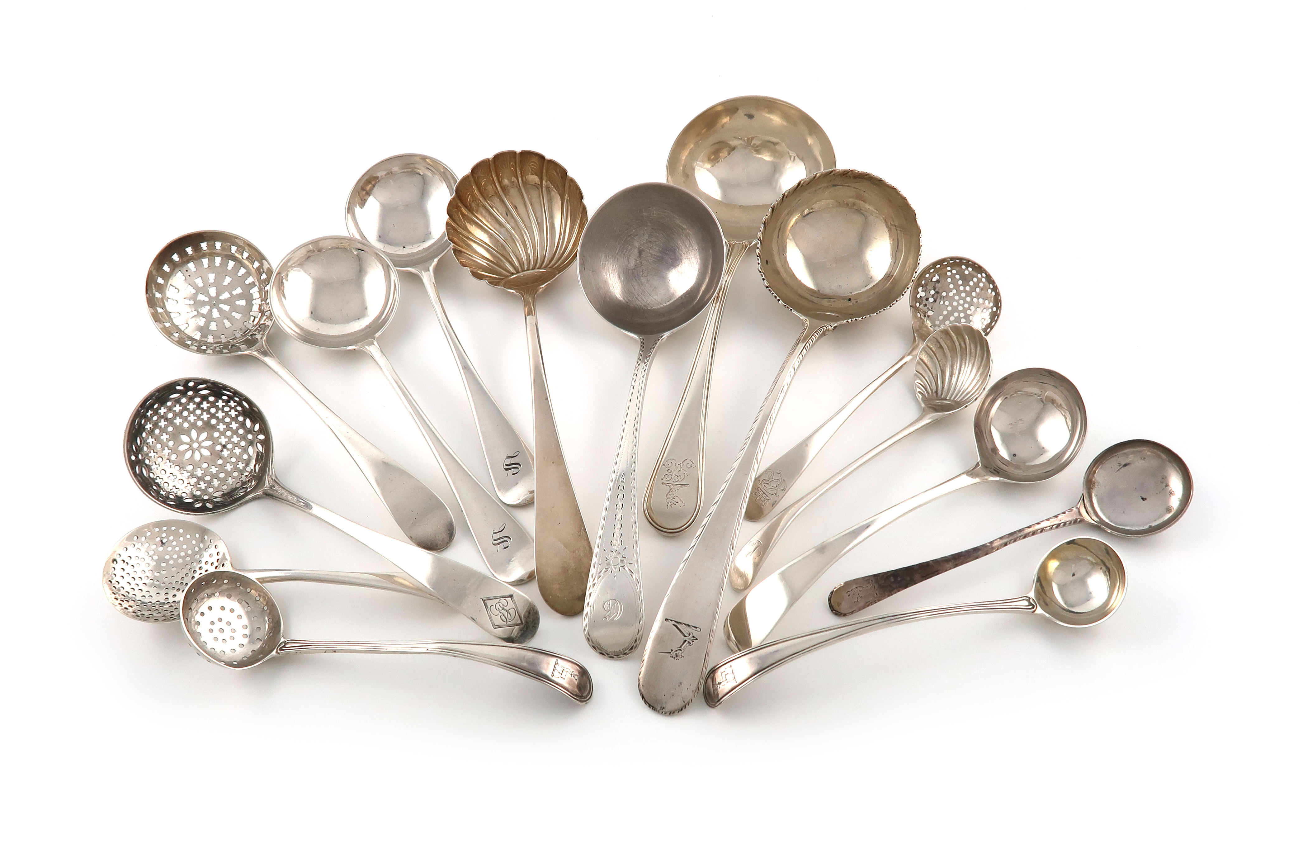 A collection of silver sauce ladles and sifting spoons,