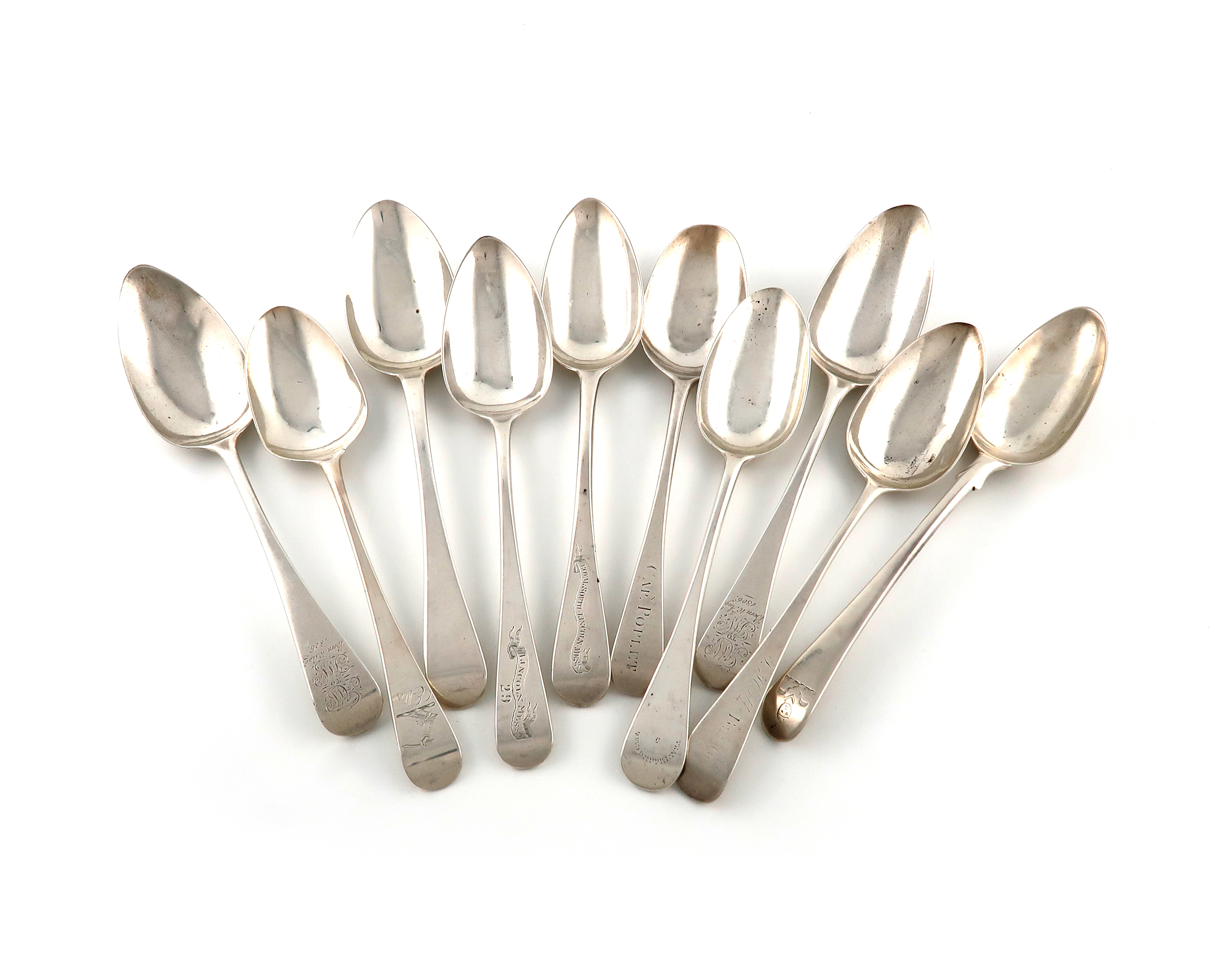 A collection of ten antique silver Old English pattern tablespoons with inscriptions,