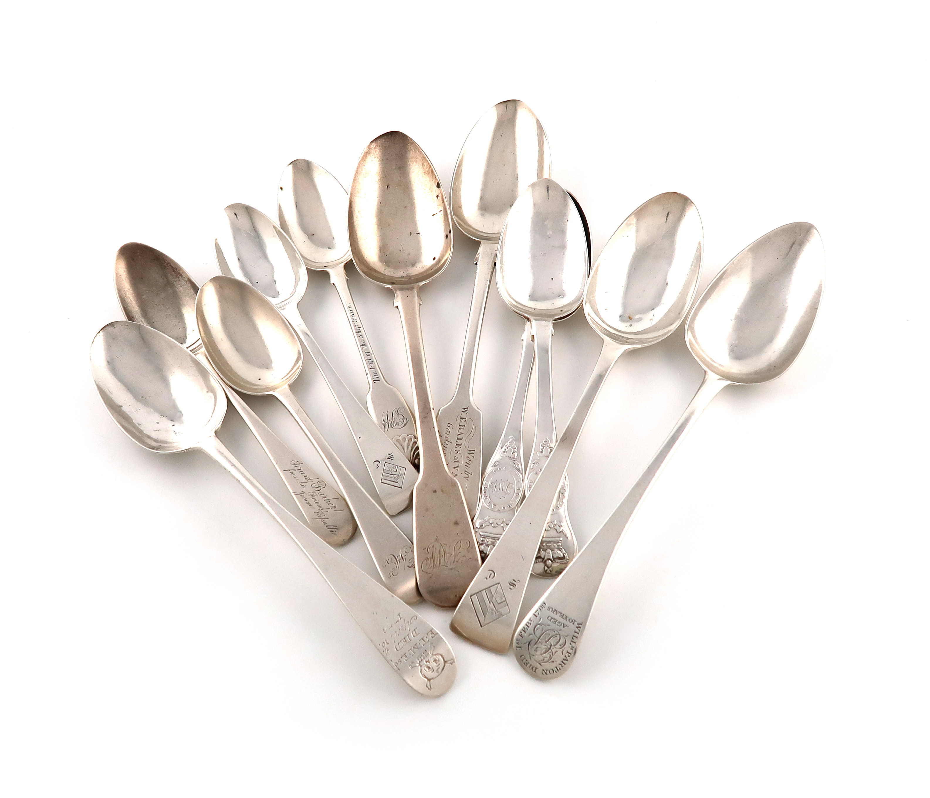 The inscription include: 'The Gift of the Ship Grace', 'Won by W. E. Bale at Vauxhall Gardens, Yarmouth, 4 July 1848', 'Keys Gracechurch Sir'. 'I. B. H Ram Hotel', 'Gerard Barker from his Friend Jerome Viasalli', one engraved with a skull and cross bones and inscribed E. Y. M. Esq. Died April 10th 1778', plus three others and two private-die dessert spoons, the reverse inscribed 'White grapes' , approx. weight 18.4oz. (qty)