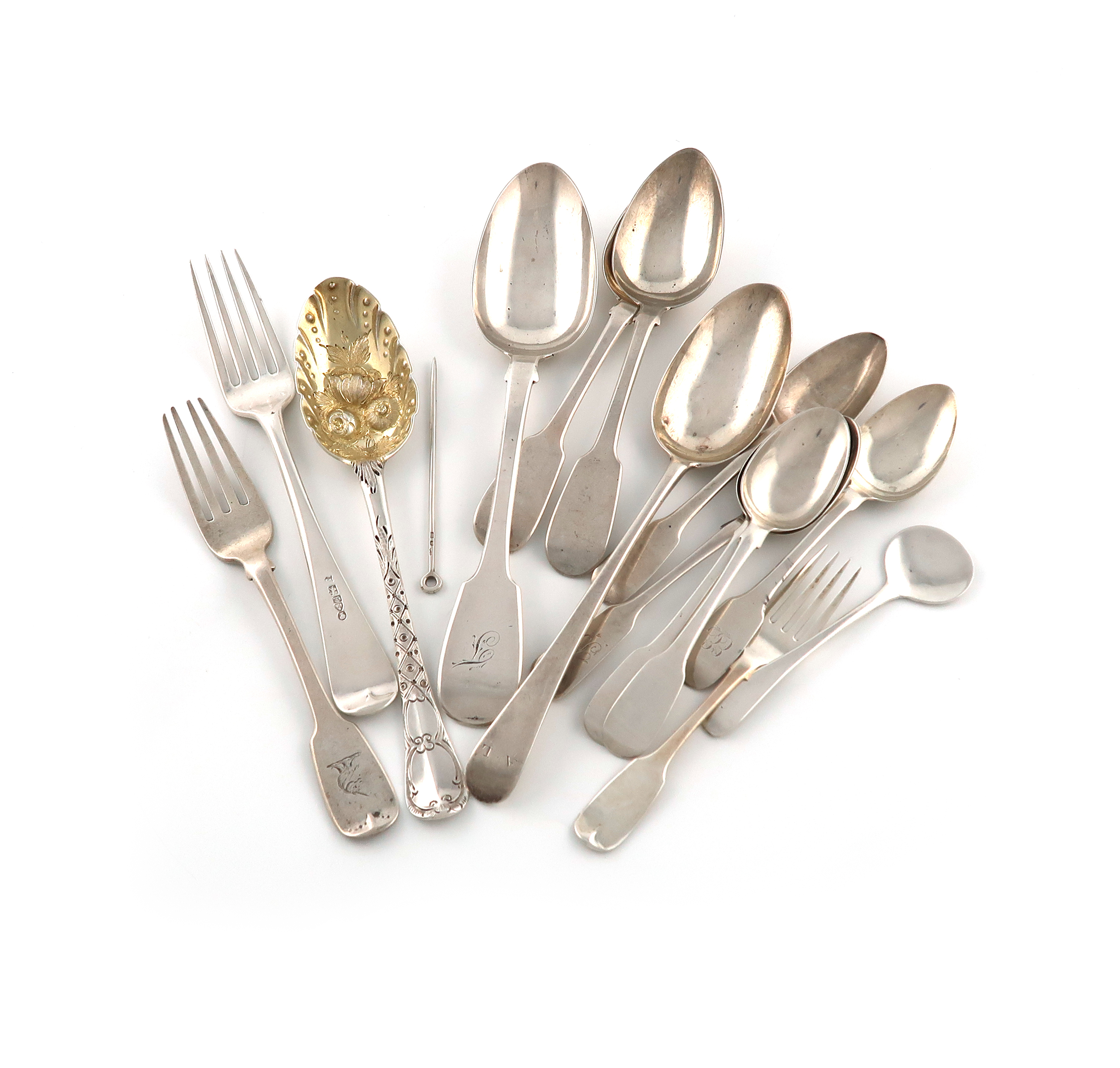 comprising: two tablespoons, a tablespoon with later berry decoration, a table fork, marked on the top surface of the terminal, a dessert fork, a small fork, two dessert spoons, a teaspoon, a salt spoon with a flattened bowl, and a poultry skewer, approx. weight 16oz. (qty)