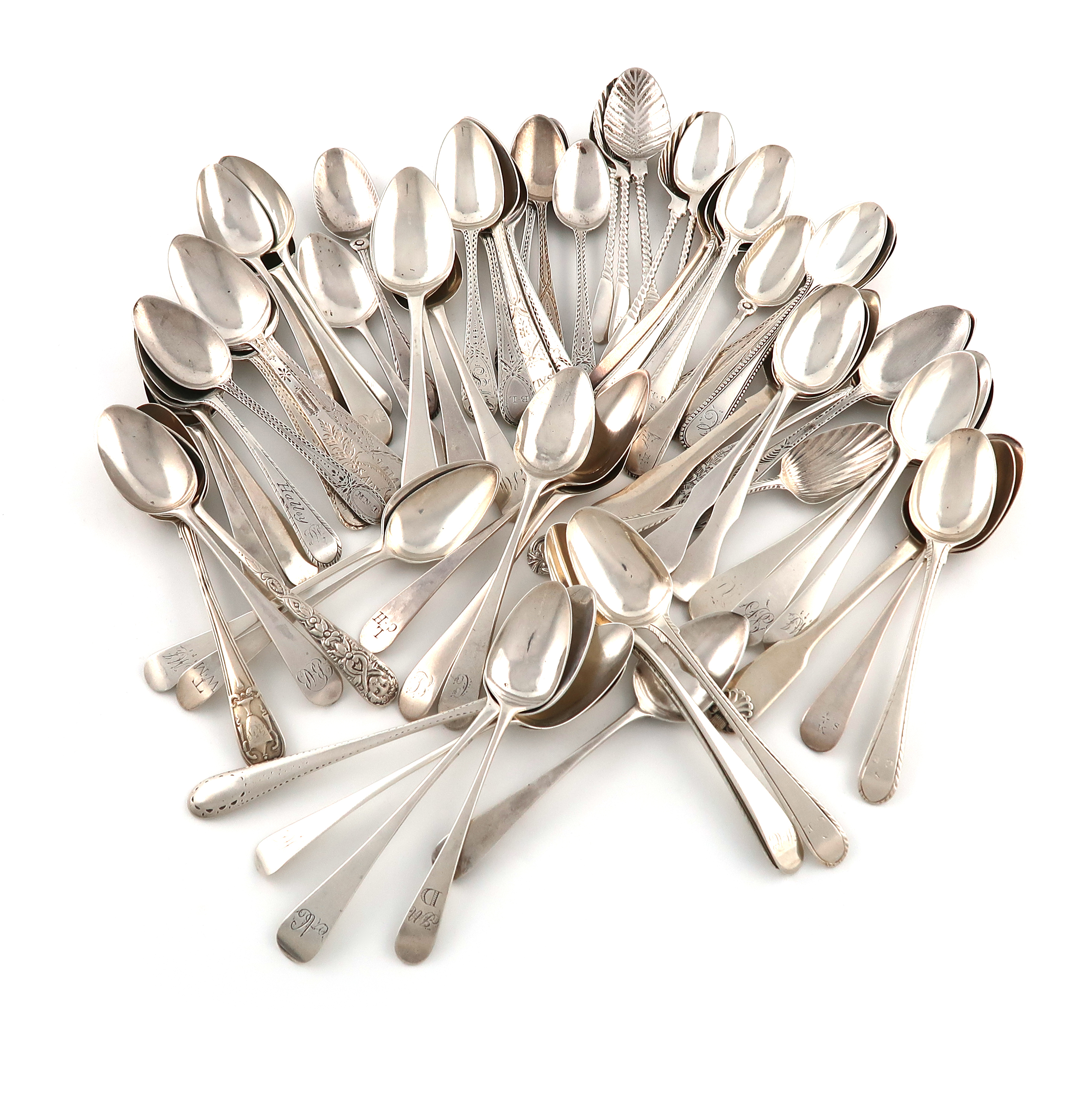 various designs, some bright-cut, some with initials and crests, approx. weight 27oz. (62)