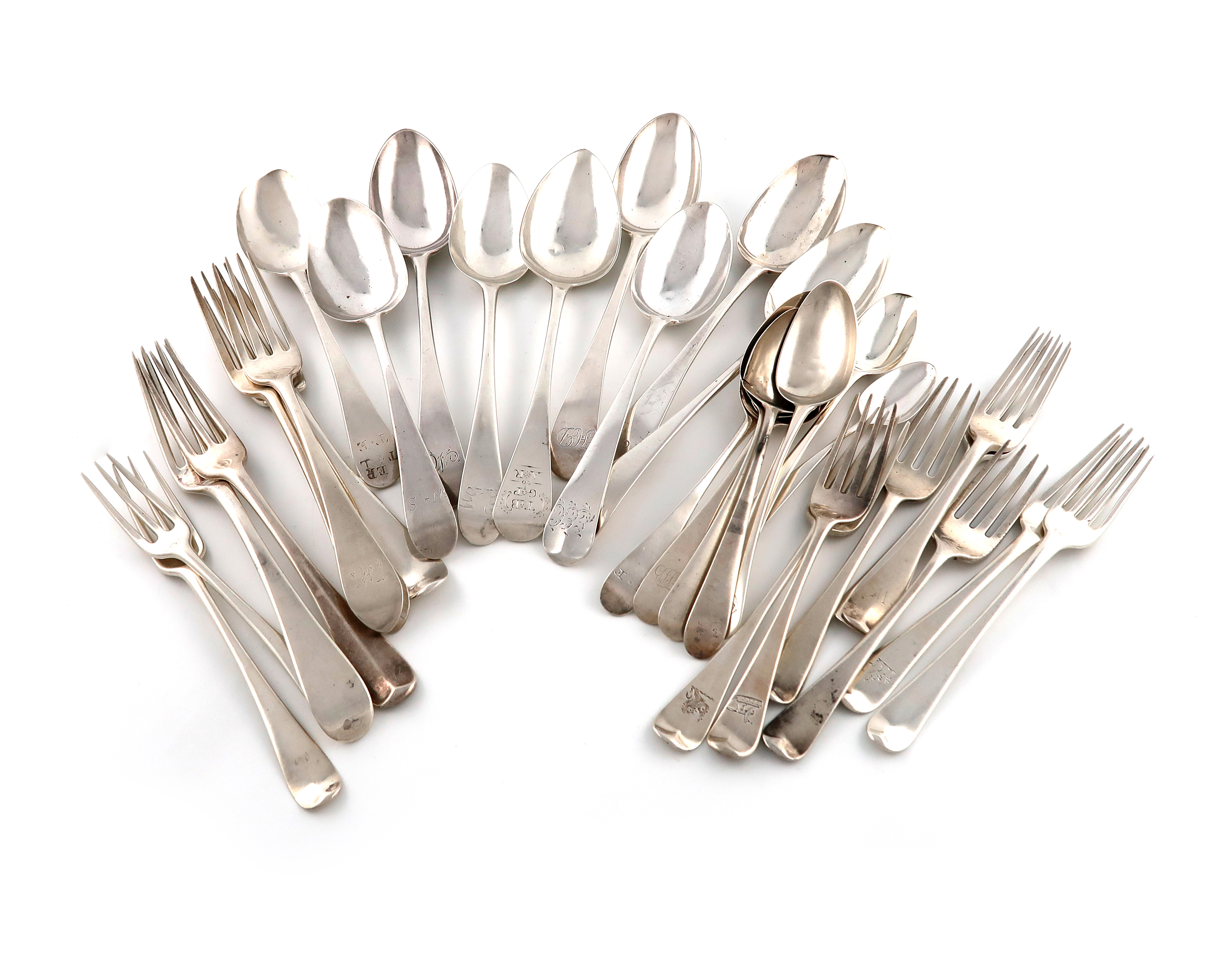 comprising: nine tablespoons, five table forks, ten dessert forks, six dessert spoons and a teaspoon, approx. weight 46.5oz. (qty)