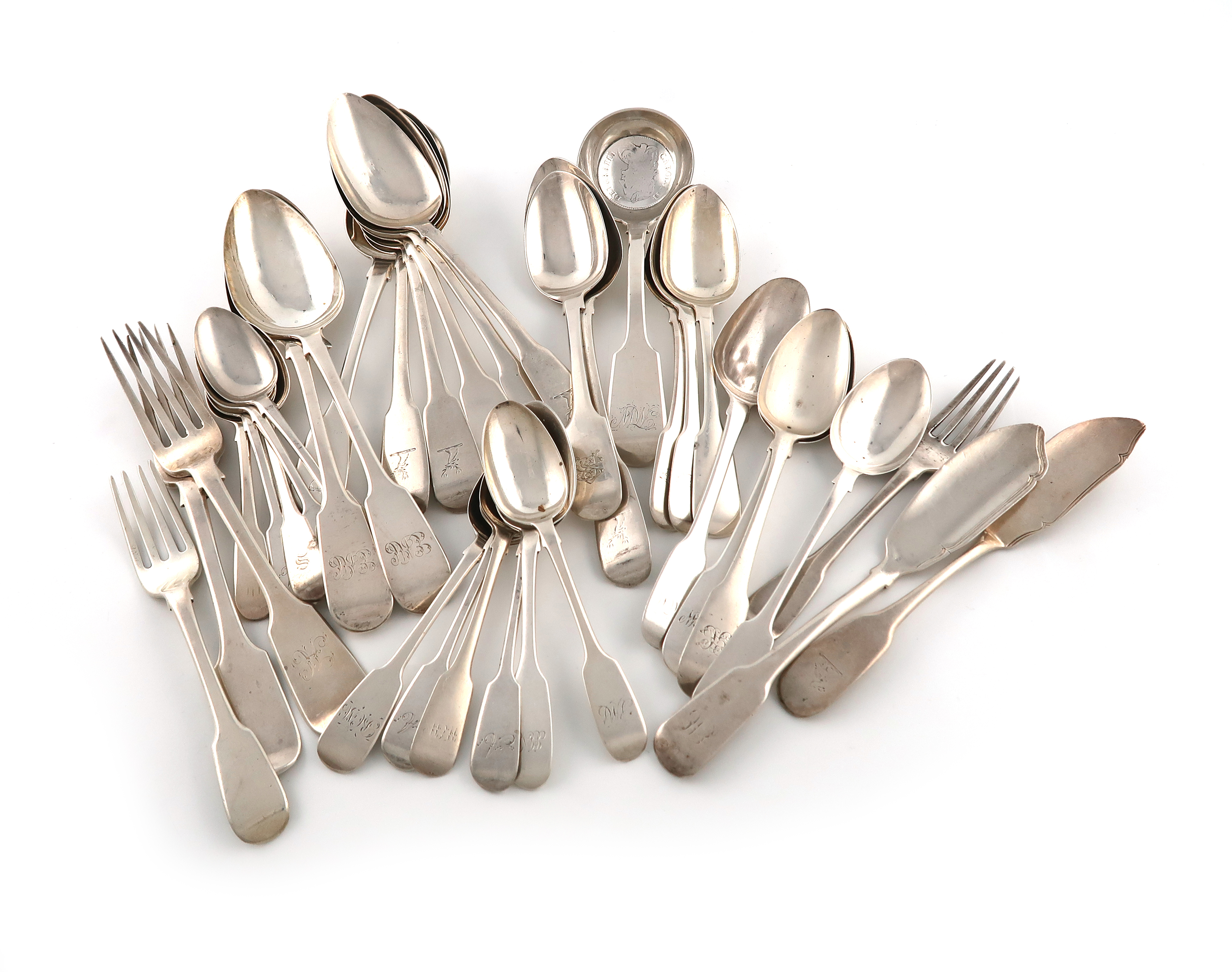 comprising: nine tablespoons, two table fork, eight dessert spoons, two dessert forks, two butter knives, eleven teaspoons and a sauce ladle, approx. weight 48oz. (qty)