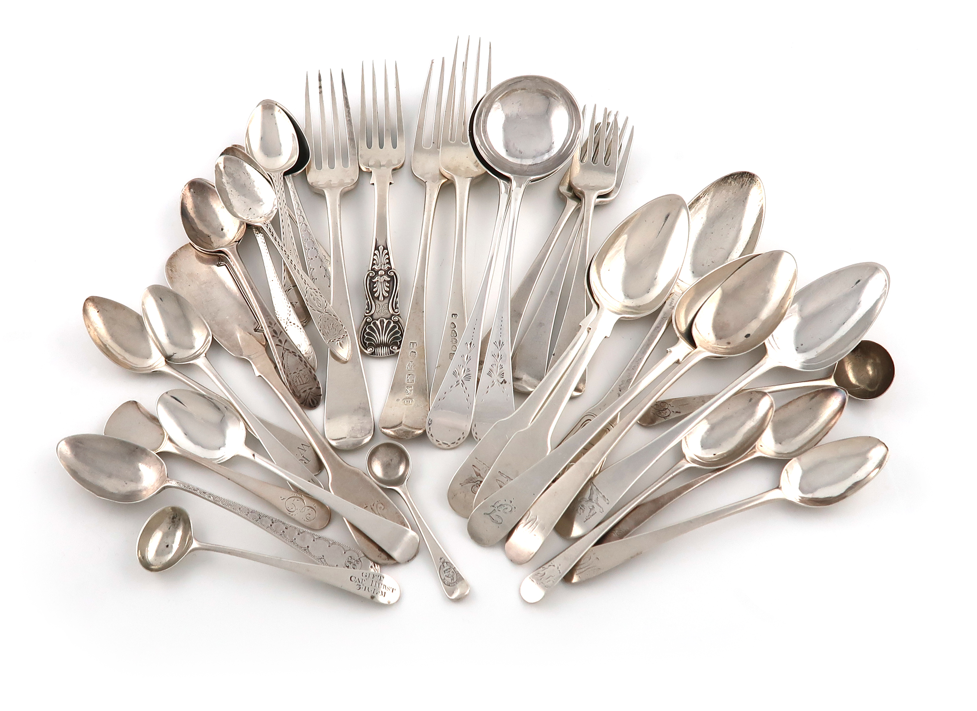 comprising: a pair of sauce ladles, by Langlands and Robertson, two table forks marked on the top surface of the terminal, another table fork, four dessert forks, six dessert spoons, a butter knife, four condiment spoons, a miniature spoon and thirteen teaspoons, approx. weight 28.9oz. (qty)