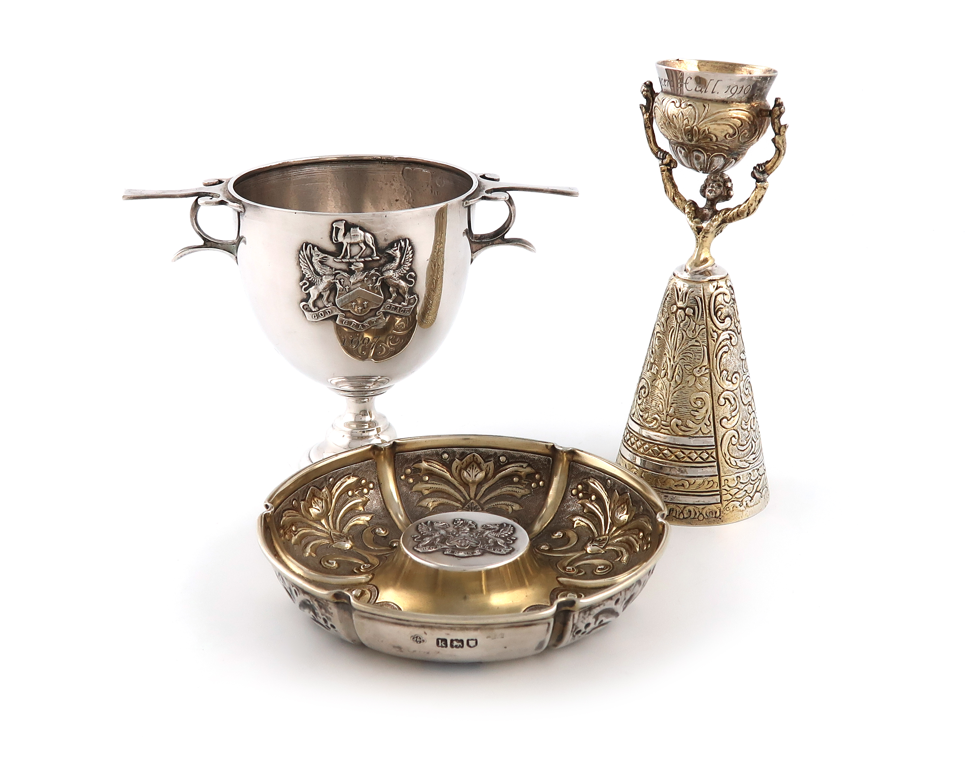 modelled as a lady in a long skirt, embossed decoration, with arms aloft holding a cup, height 14.5cm, inscribed Grocer's Hall 1910, plus a silver two handled cup, London 1906, applied with the Company arms and inscribed 1907, and a silver-gilt dish, London 1905, circular form, embossed decoration, with the Company arms and inscribed 29 May 1906, approx. total weight 10.5oz. (3)