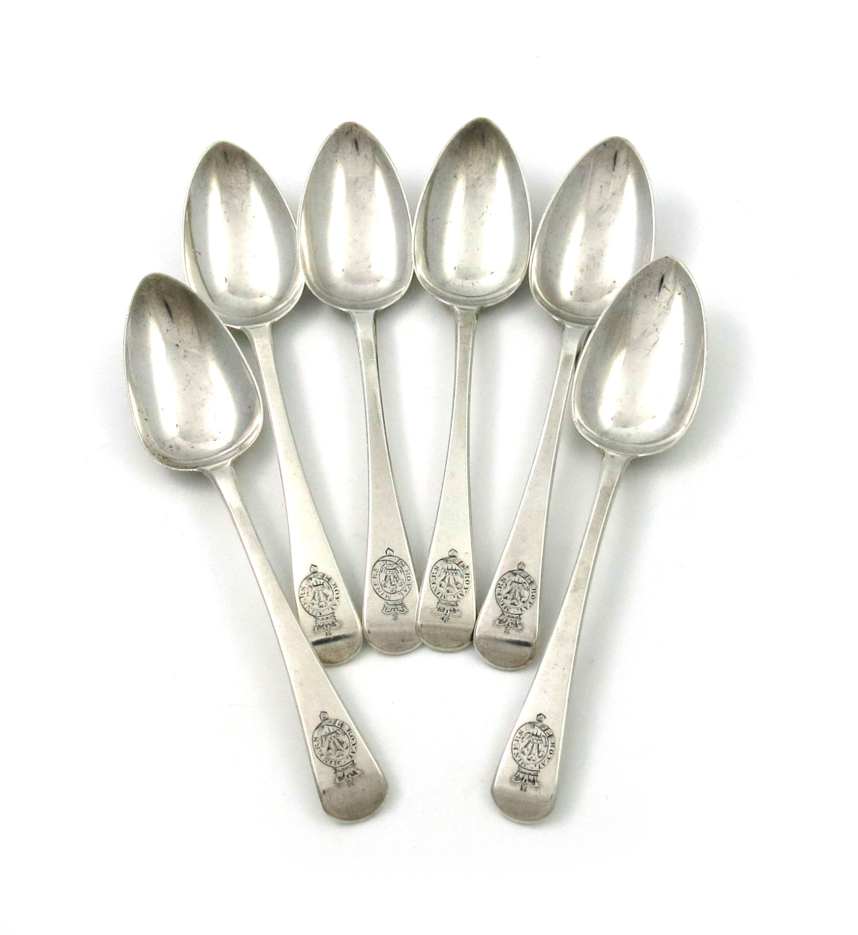 A set of six George III silver regimental dessert spoons, The Royal Cornwall and Devon Miners Regiment of Militia (The Royal Miners),
