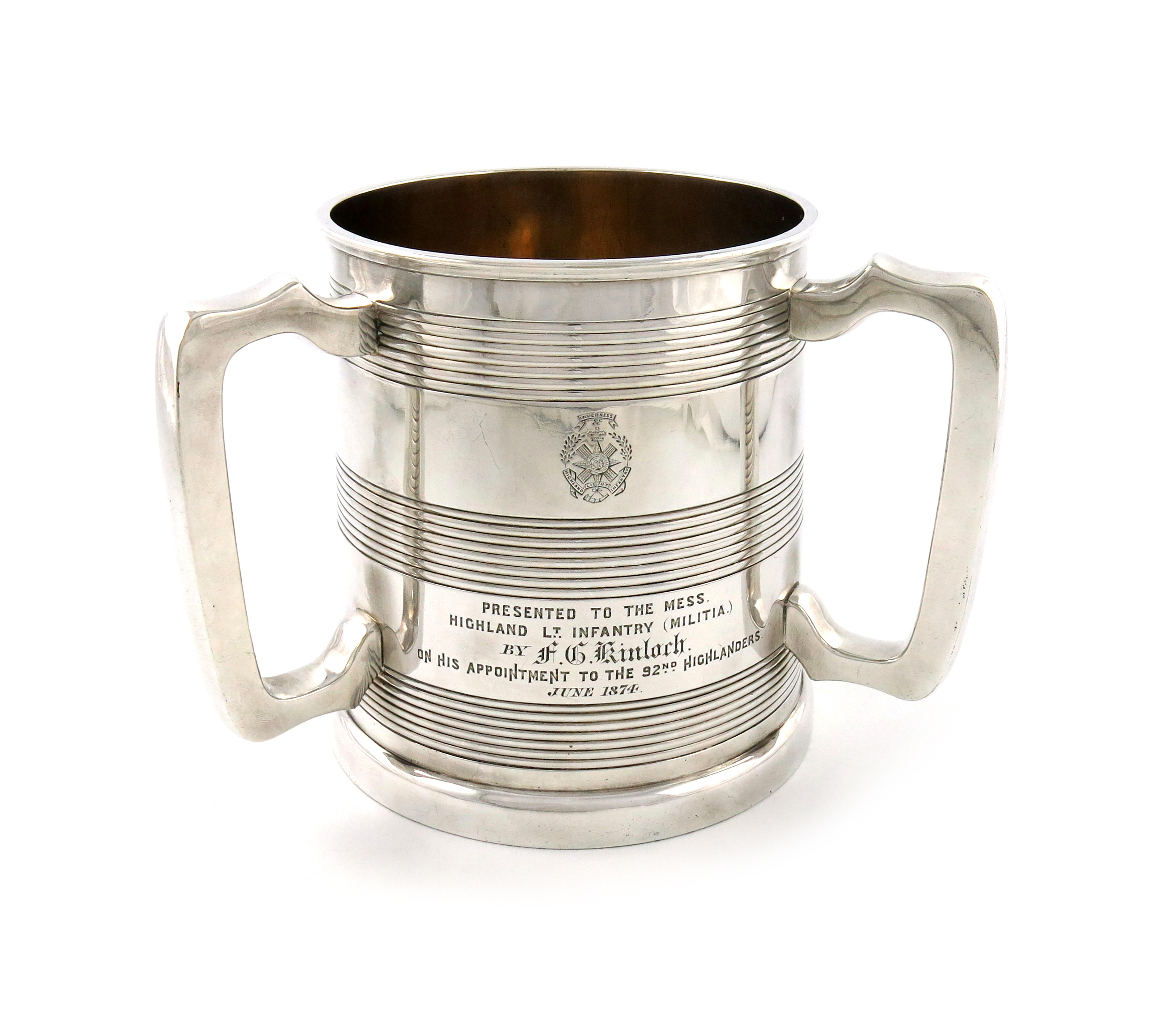 tapering circular form, with three bands of reeded decoration, plain handles, engraved with the badge and inscribed 'Presented to The Mess Highland Lt. Infantry (Militia), by F.G. Kinloch on his appointment to the 92nd Highlanders, June 1874', height 16.8cm.