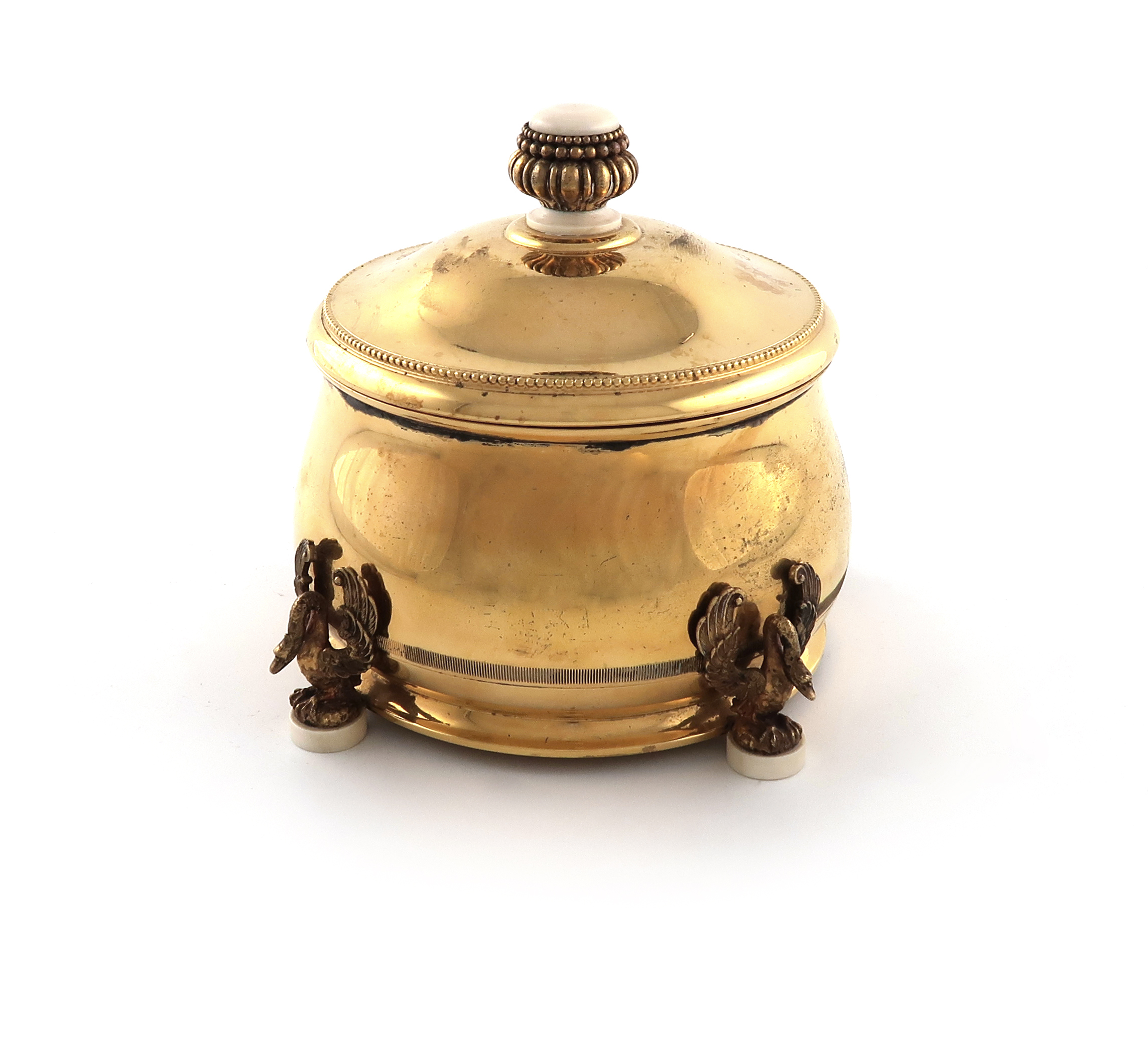 circular bellied form, the pull-off cover with a fluted and ivory finial, beaded borders, on four swan feet with spread wings on four ivory pads, height 13.5cm, approx. weight 19.5oz.