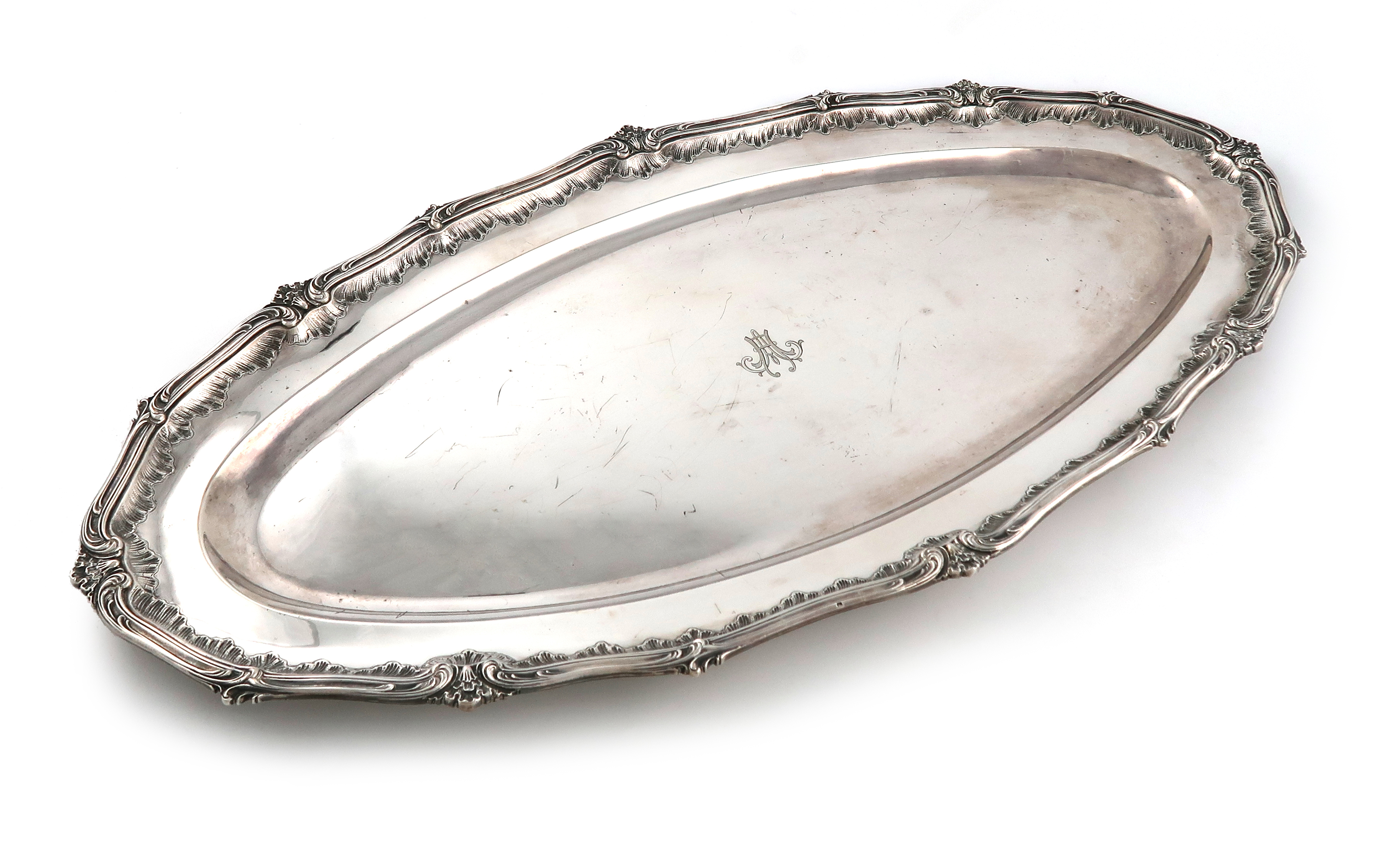 elongated oval form, shell and scroll border and with rocaille decoration, the centre with a monogram, length 71.3cm, approx. weight 93oz.