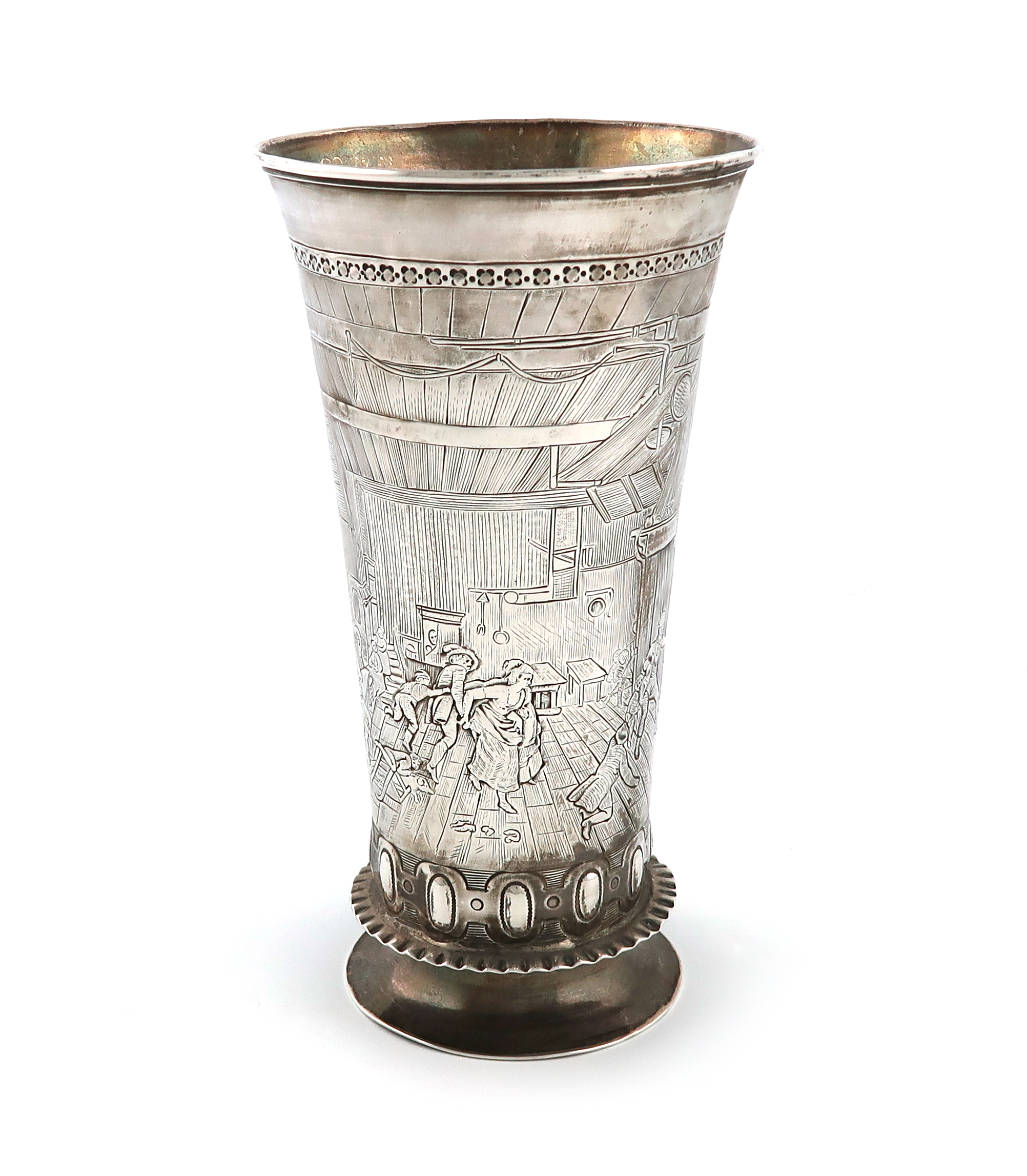 tapering circular form, chased with a figural scene, embossed and stamped borders, on a circular foot, height 20.8cm, approx. weight 13.9oz.
