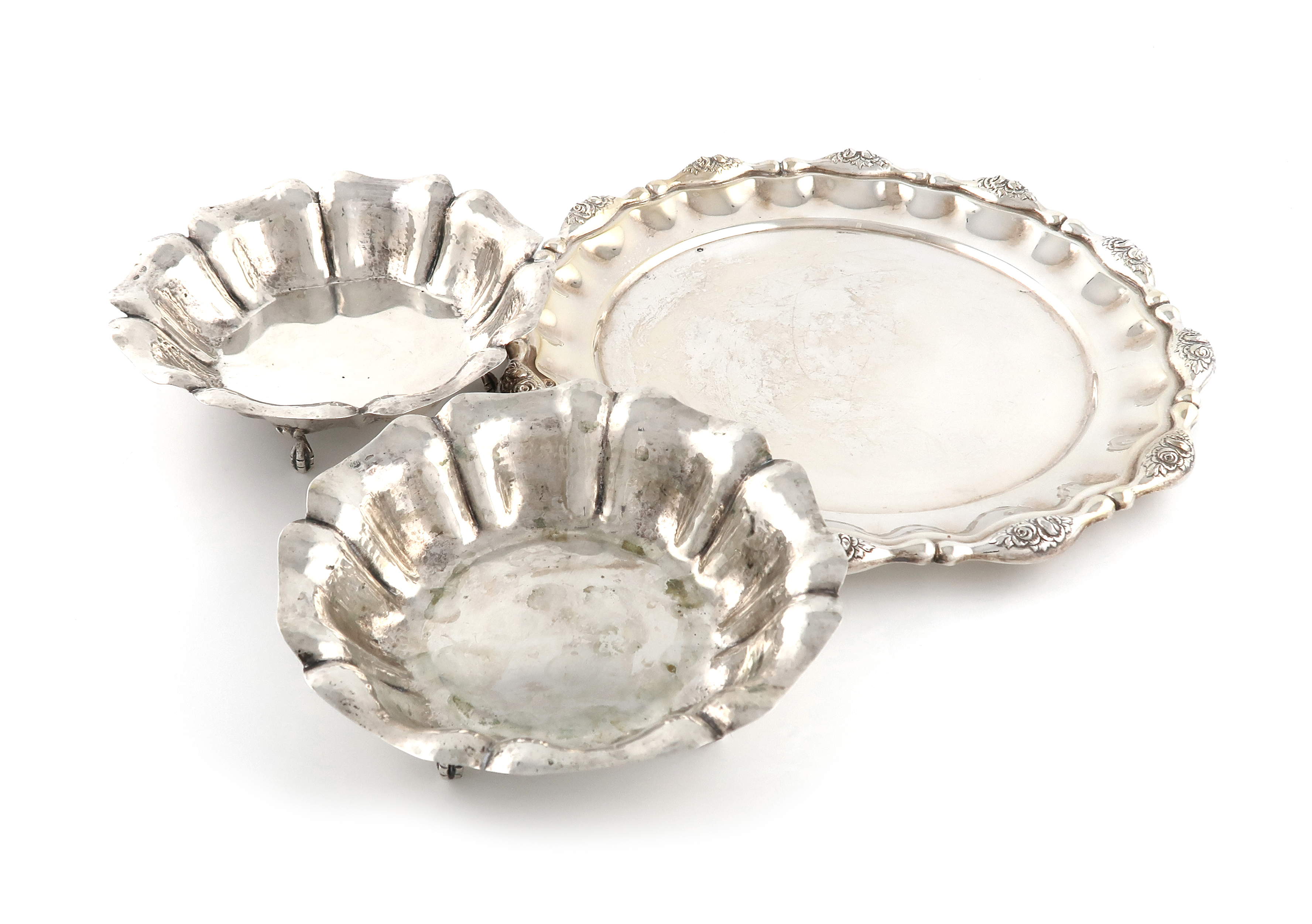 circular form, lobed foliate border, diameter 29.5cm, plus a pair of continental silver dishes, of lobed circular form, on four claw feet, approx. total weight 24.5oz. (3)