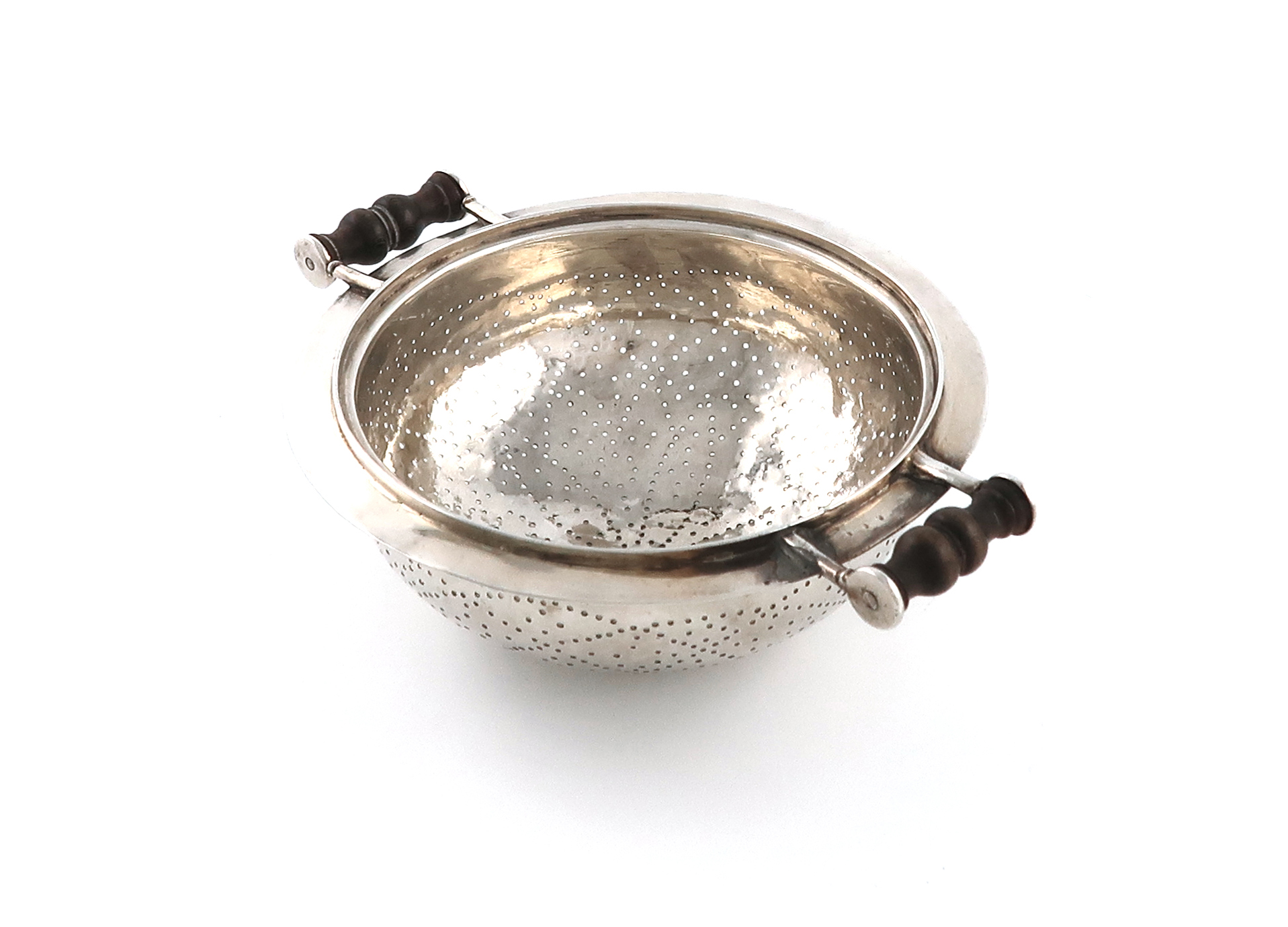 circular form, pierced decoration, turned wooden side handles, length handle to handle 14.5cm, approx. weight 2.9oz.