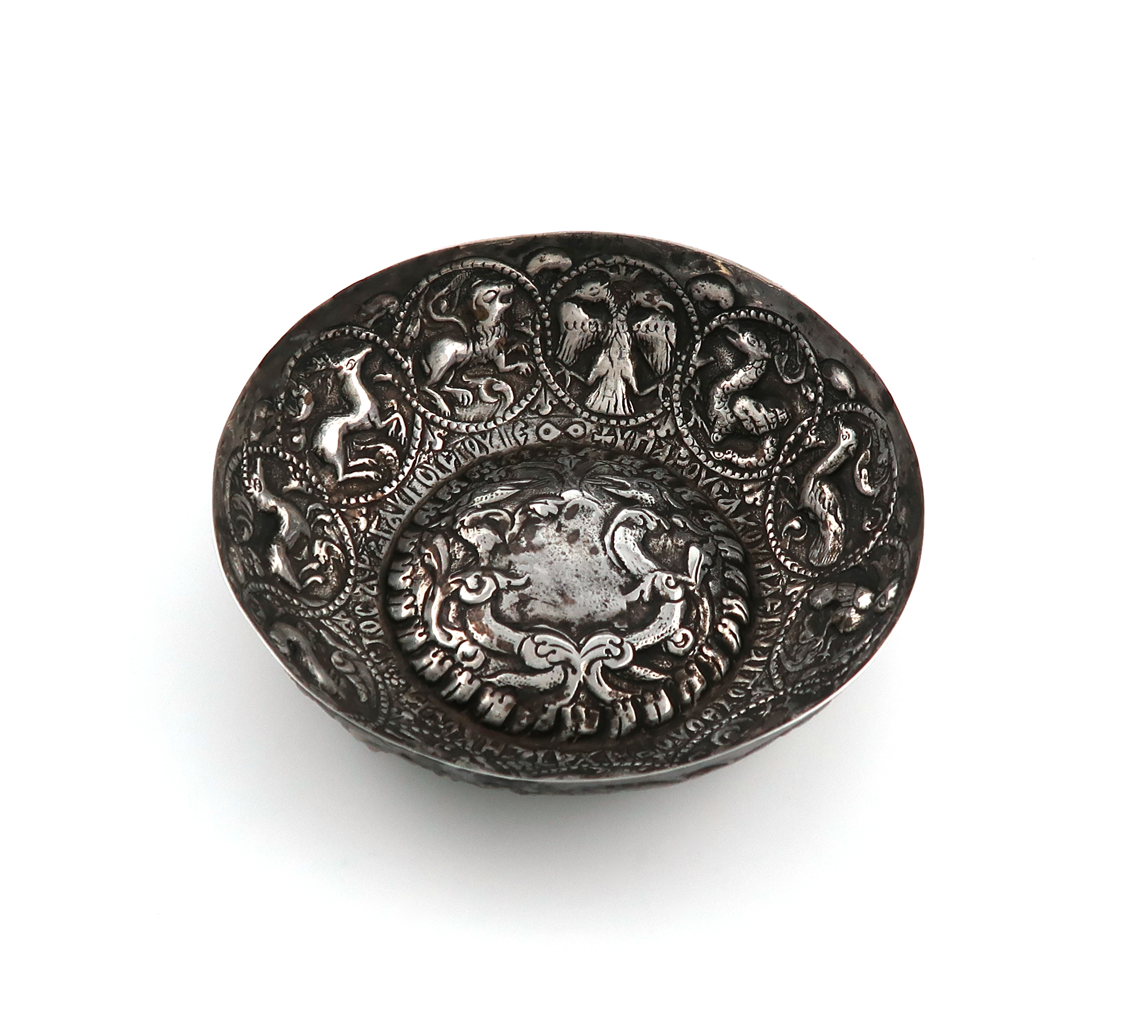 circular form, embossed with birds and animals, diameter 12cm.