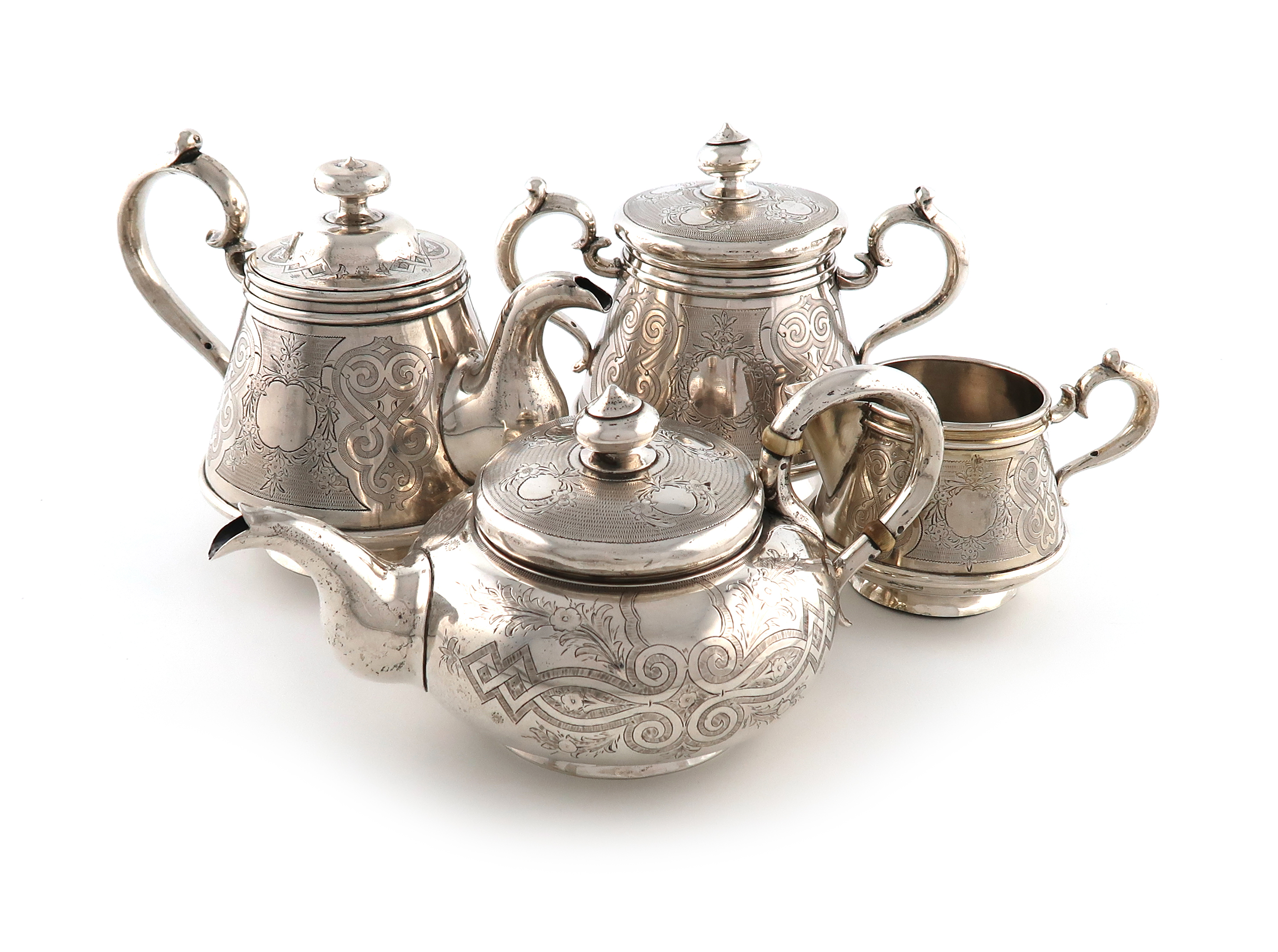 tapering circular form, engraved foliate scroll decoration, scroll handles, pull-off covers with knop finials, plus a 19th century Russian silver bachelor's teapot, assay master Viktor Savinkov, Moscow 1870, circular bellied form, engraved decoration, the scroll handle with ivory insulators, height of teapot 11.5cm, approx. weight 30oz. (4)