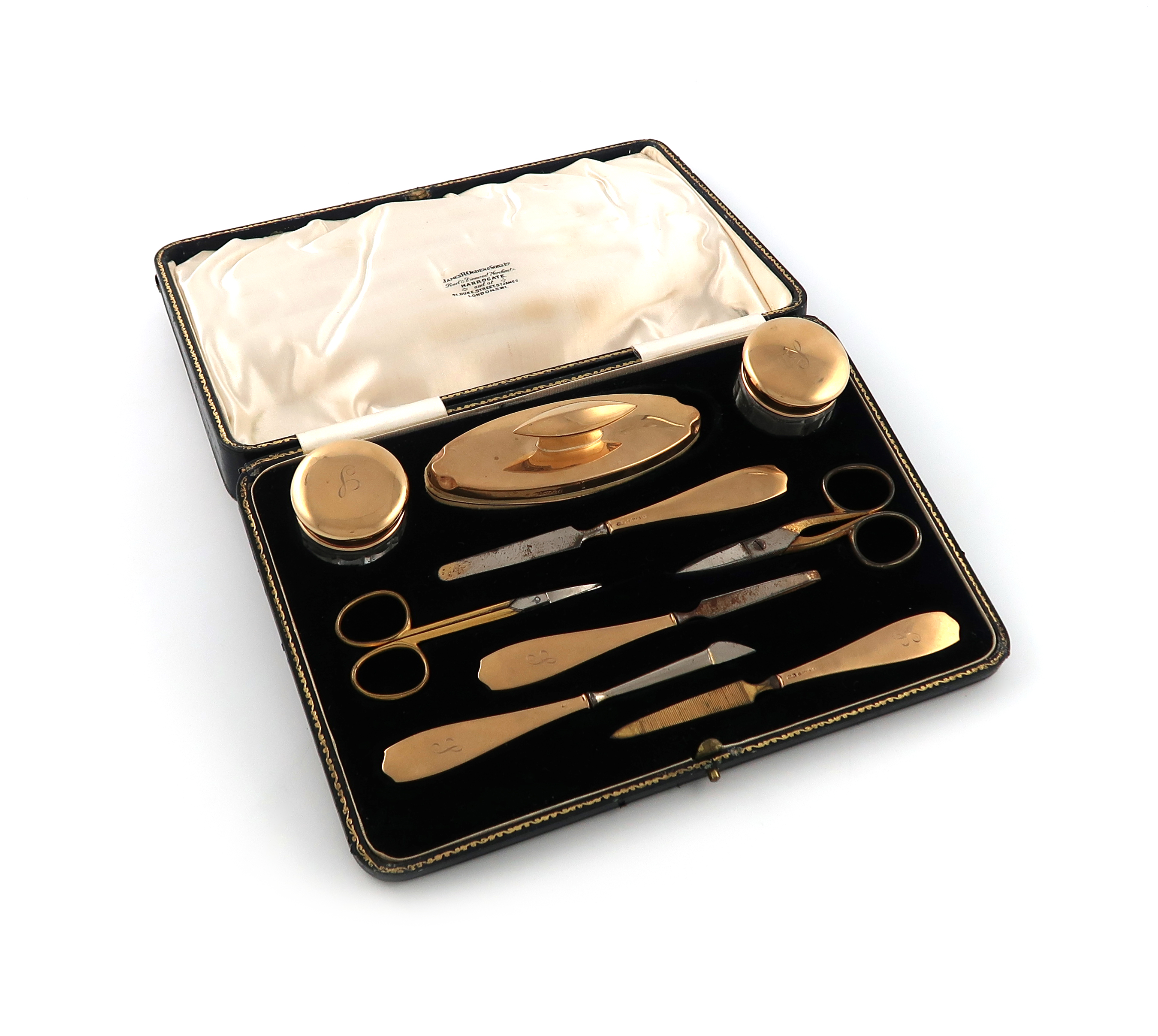 initialled 'S', comprising: two gold-mounted toilet jars, a buffer, four gold handled manicure items and two pairs of gilded steel scissors, in a fitted case, approx. weighable 13.6g.