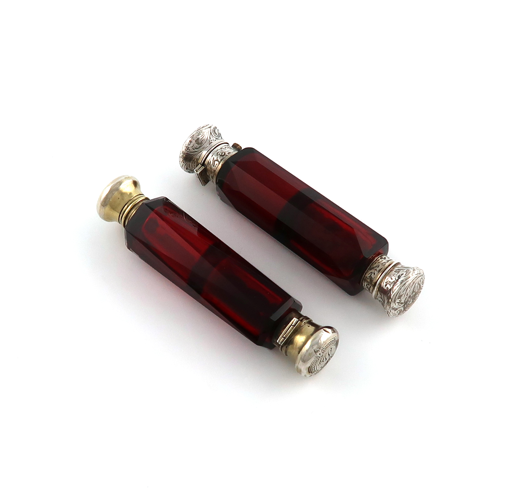 faceted cylindrical form, one end with a hinged cover, the other with a screw-off cover, engraved decoration, with traces of gilding, plus a silver-gilt mounted red glass double scent bottle, the covers engraved and initialled. (2)