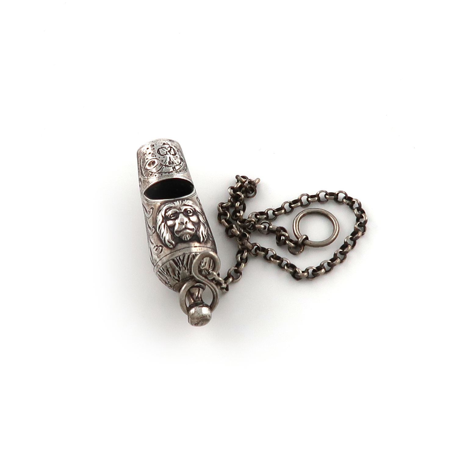 tapering form, engraved foliate decoration and mounted with a lion mask motif, with a ring and chain, length 4.7cm, approx. weight 0.6oz.