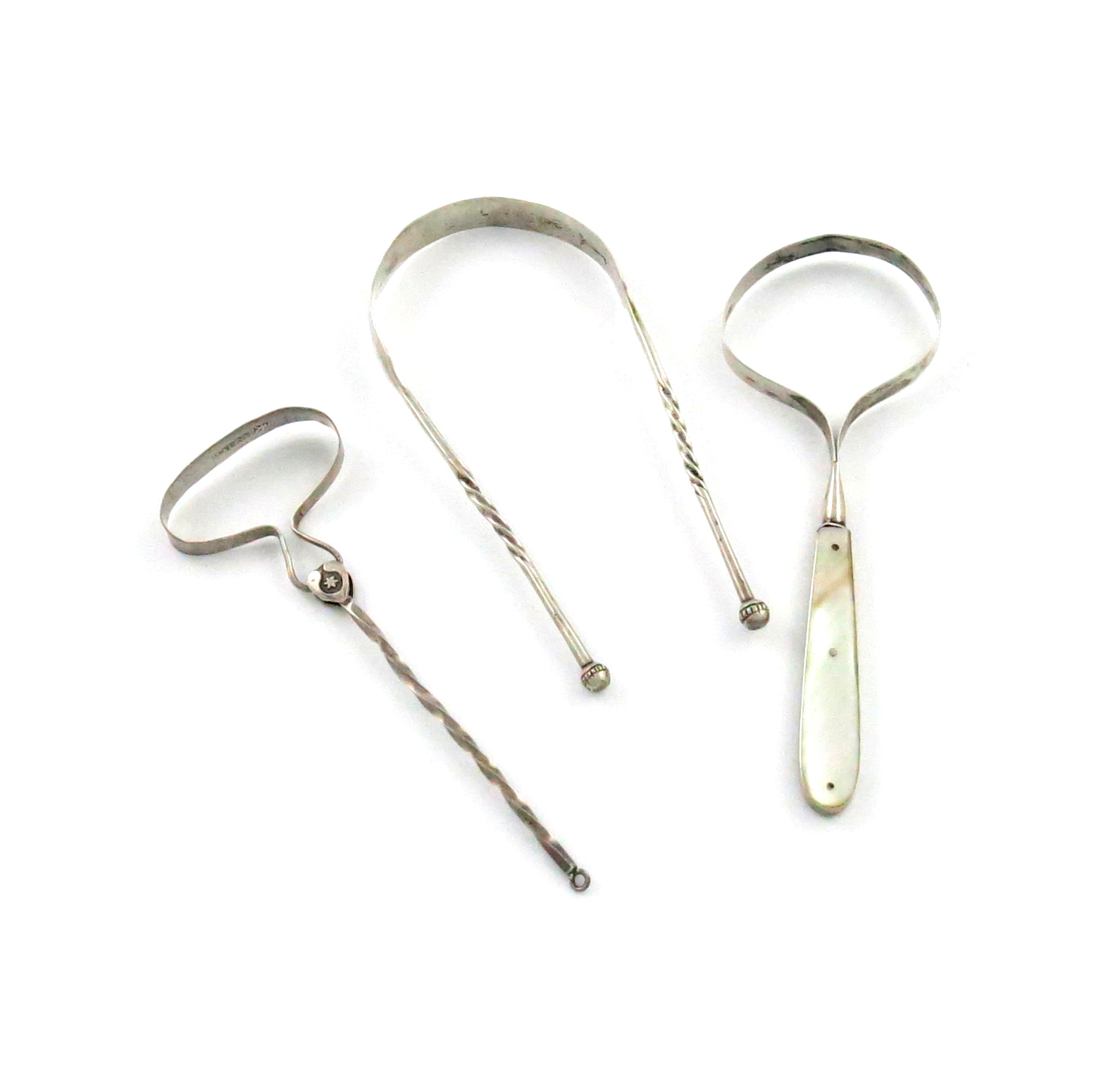 comprising: a Chinese one, with a twisted handle, a tong shaped one with twisted decoration and ball terminals, and one with a mother-of-pearl handle. (3)