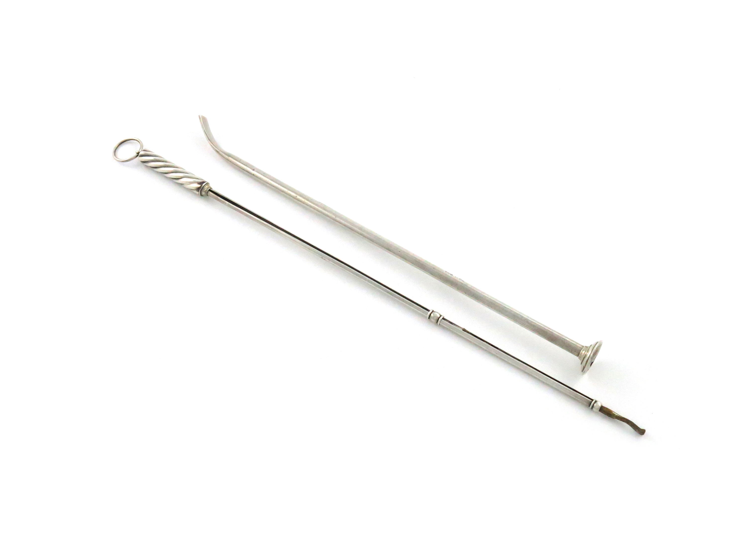 swirl fluted handle with a ring attachment, slender slide-action cylindrical stem, length 33.8cm, plus an Edwardian silver candelabra douser, by S. Mordan and Co., Chester 1908, curved cylindrical form, with a mouth-piece, length 30cm, approx. weight 1.8oz. (2)