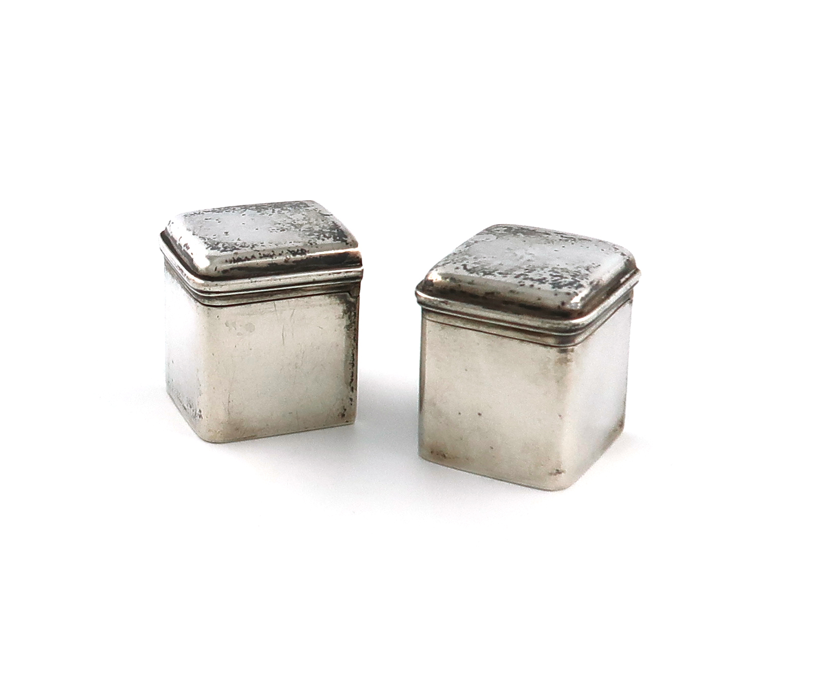 rounded rectangular form, plain hinged covers, height 3.3cm, approx. weight 2.2oz. (2)