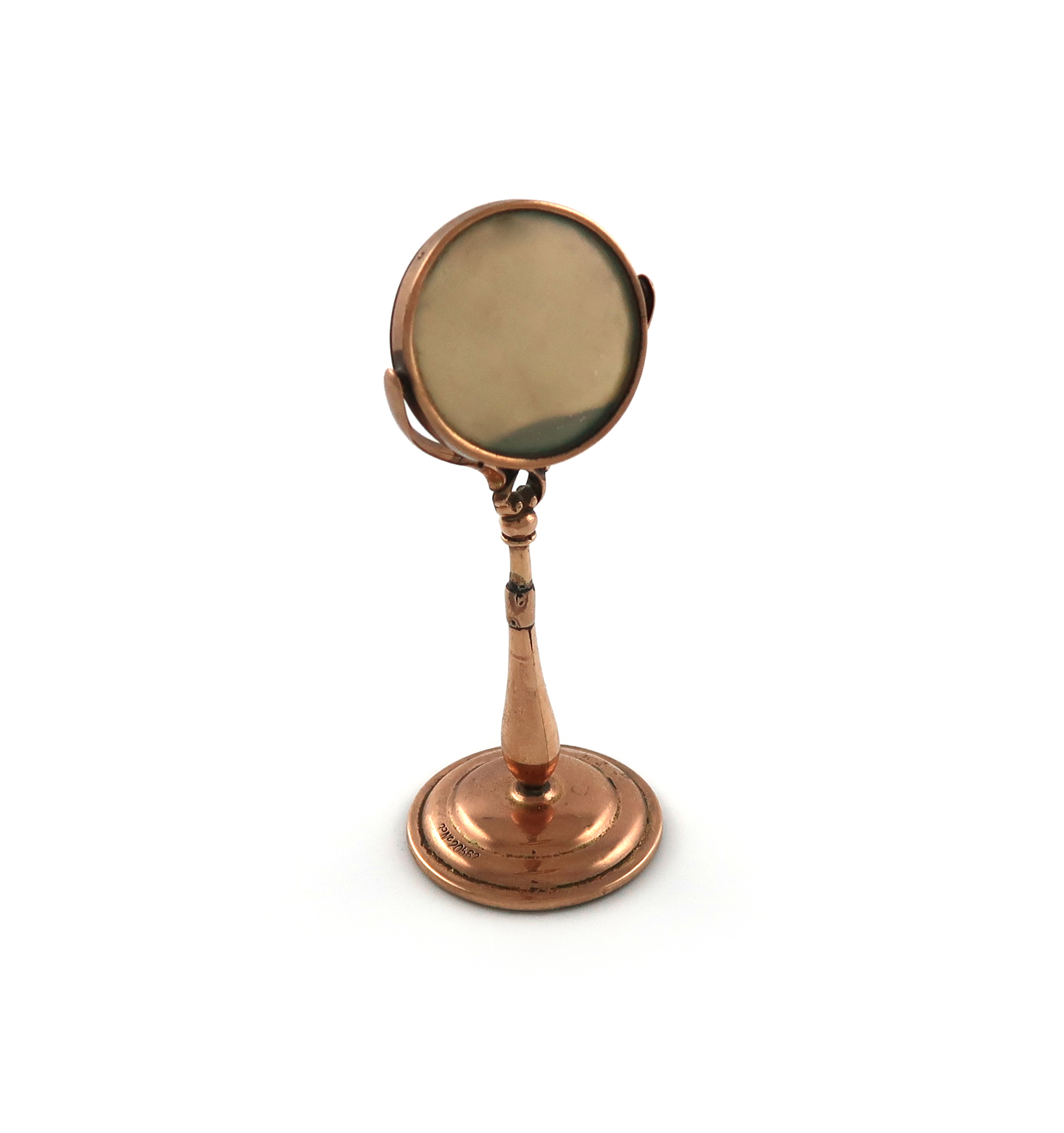 baluster stem, with a double sides swing circular frame, on a raised circular base, height 9.4cm.