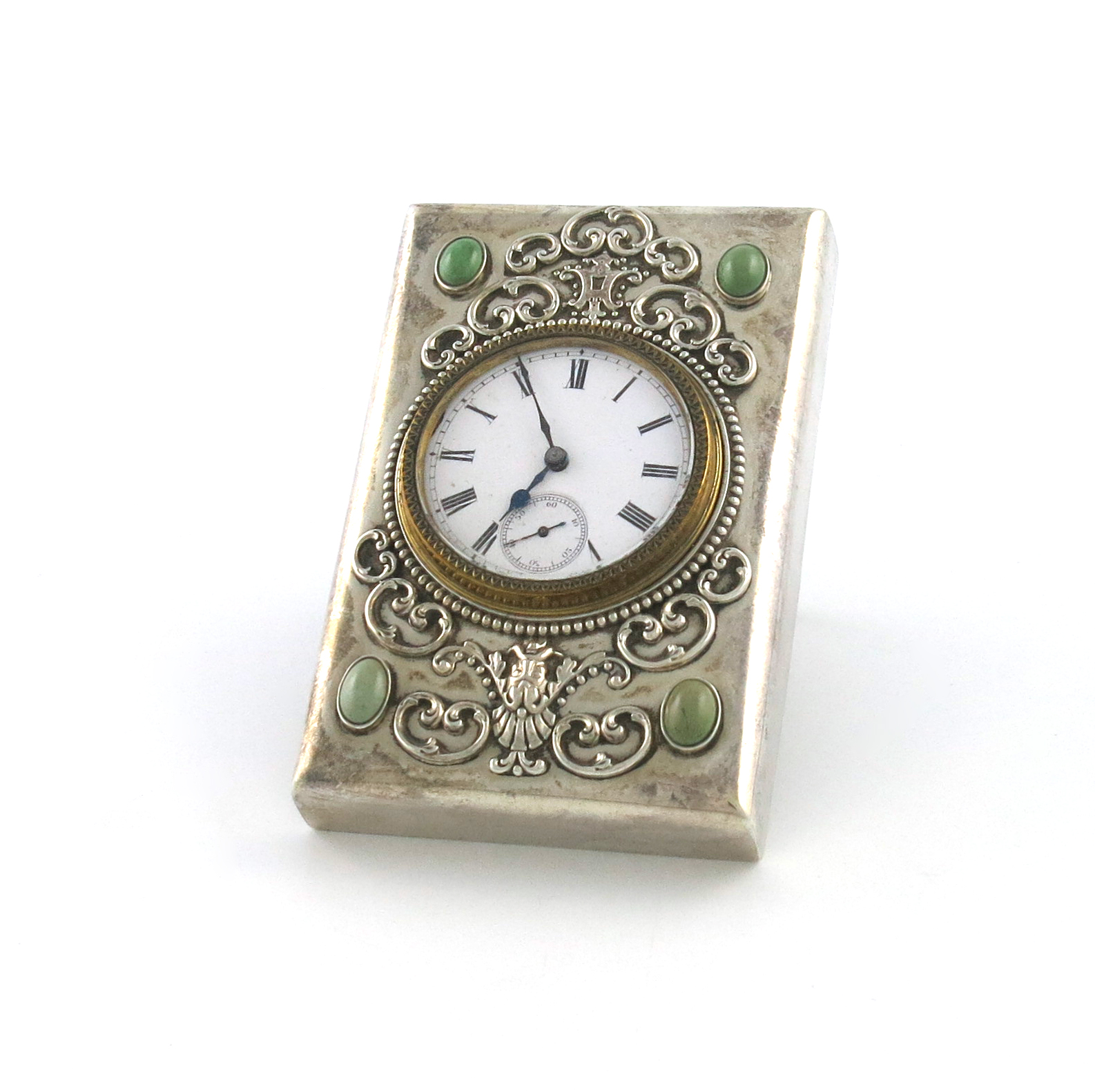rectangular form, applied with a mask and scroll decoration, and with four oval green cabochons, base metal easel back, length 10cm.