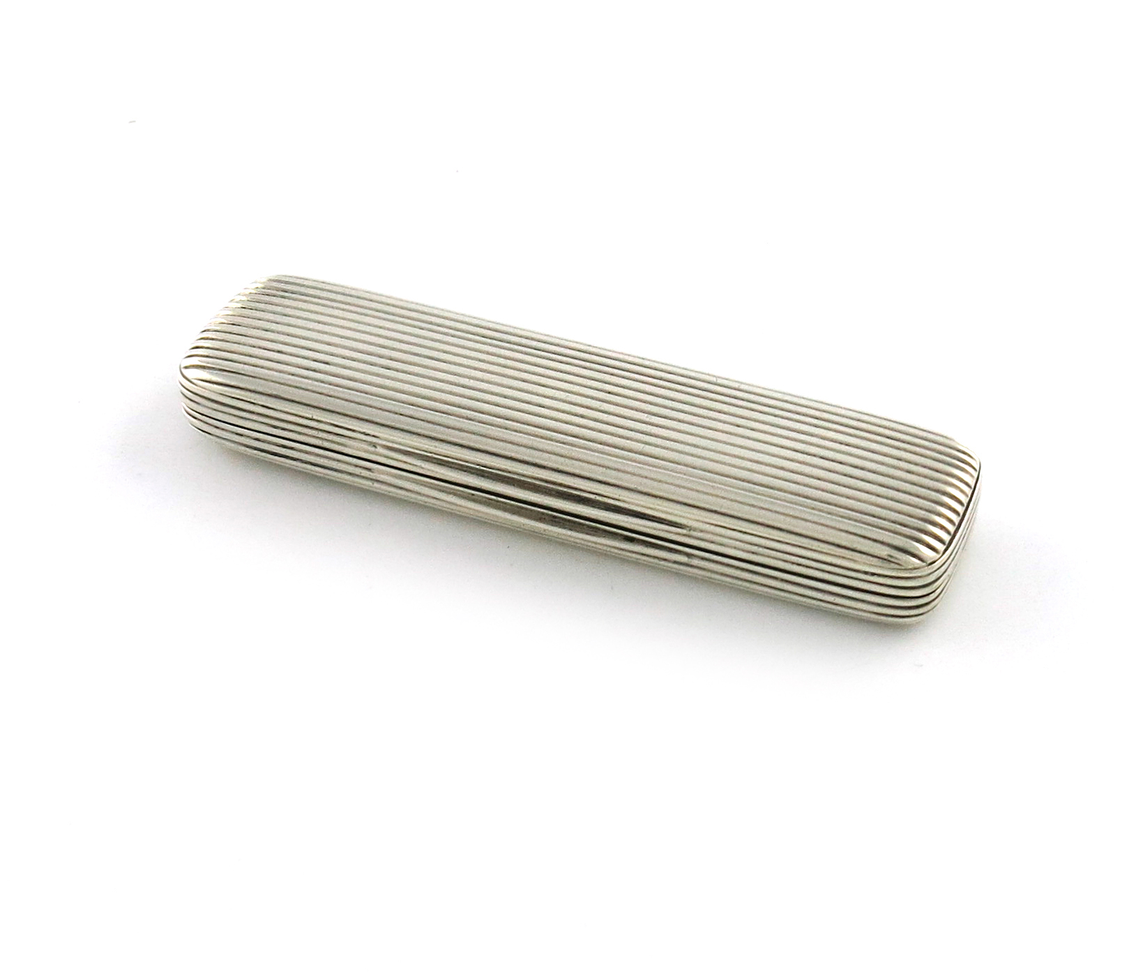 rectangular form, reeded decoration, the interior with a mirror, (cracked), length 8.5cm, approx. weight 1.2oz.