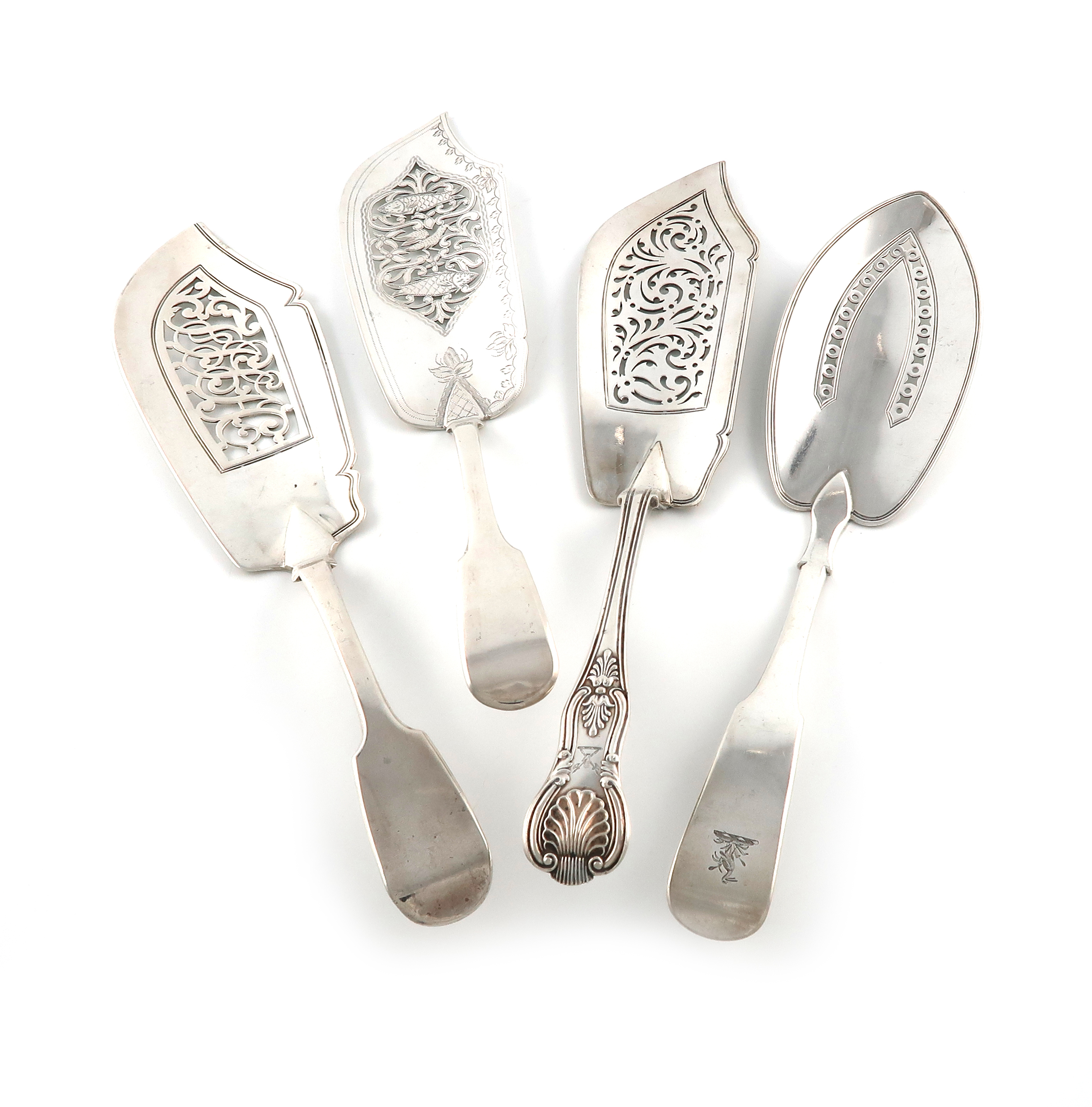 comprising: a Kings pattern one by George Adams, London 1846, a Fiddle pattern one by Hayne and Cater, London 1846, the blade pierced and engraved with fish, a Fiddle pattern with a blade pierced with lettering, possibly spelling 'fish', and another Fiddle pattern example, approx. weight 18.4oz. (4)