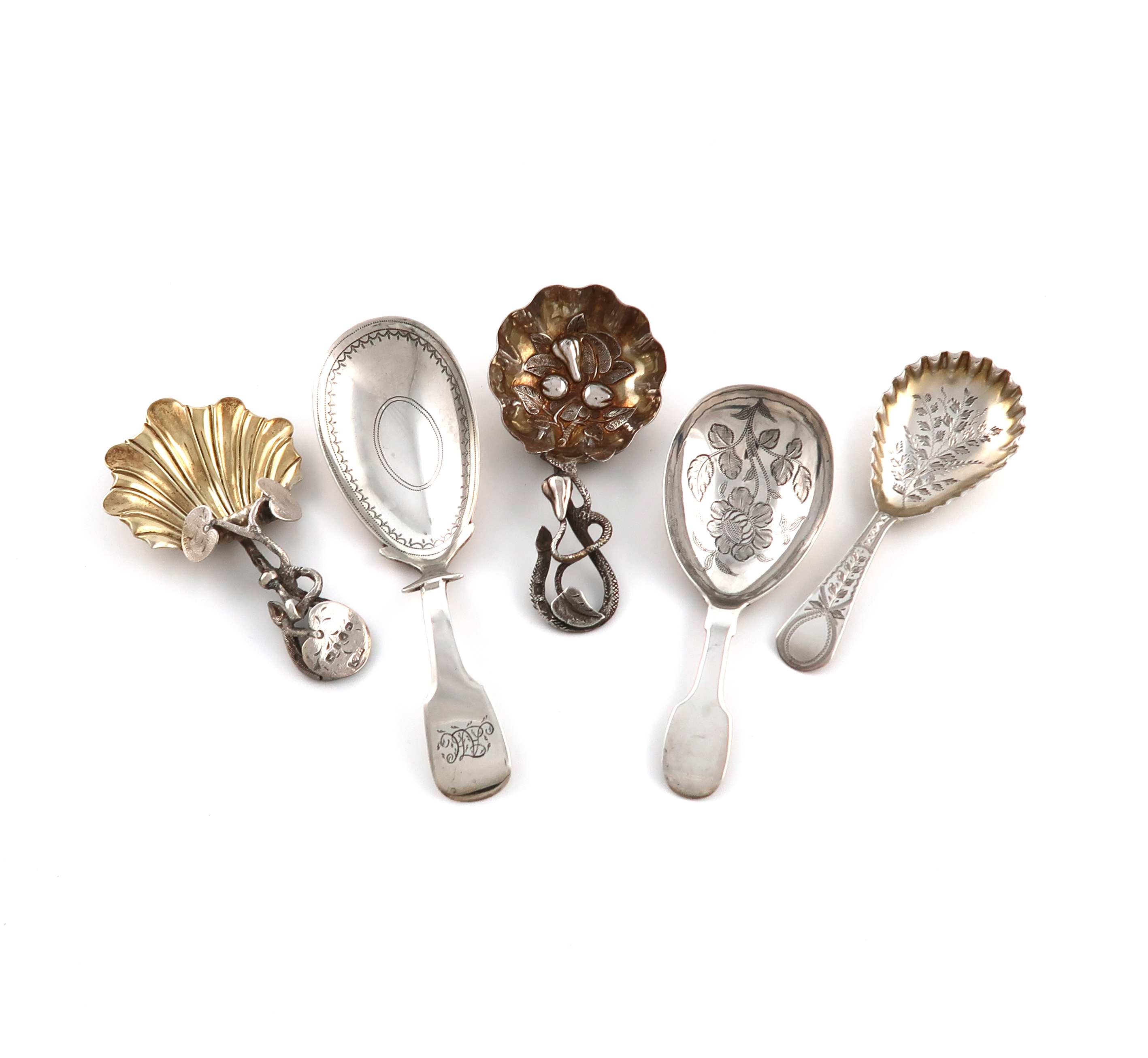 comprising: a George III one by Thomas James, London 1813, with a Fiddle and fish-tail handle, initialled, plus three by Hilliard and Thomason, Birmingham various dates, two with trailing tendril handles and decorated bowls, the other with engraved decoration, plus a Fiddle pattern caddy spoon, London 1823, approx. weight 2oz. (5)