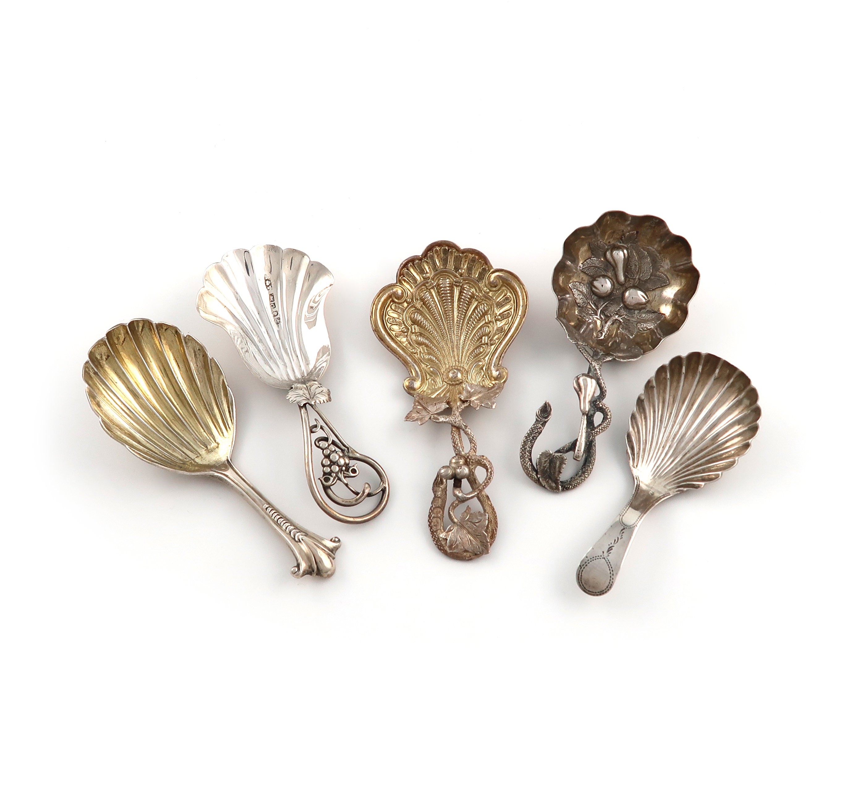 comprising: three by Hilliard and Thomason, Birmingham various dates, all with trailing tendril handles and decorated bowls, one with a silver-gilt bowl, plus one by Messrs. Lias, London 1867, and one Birmingham with a shell bowl, approx. weight 1.8oz. (5)