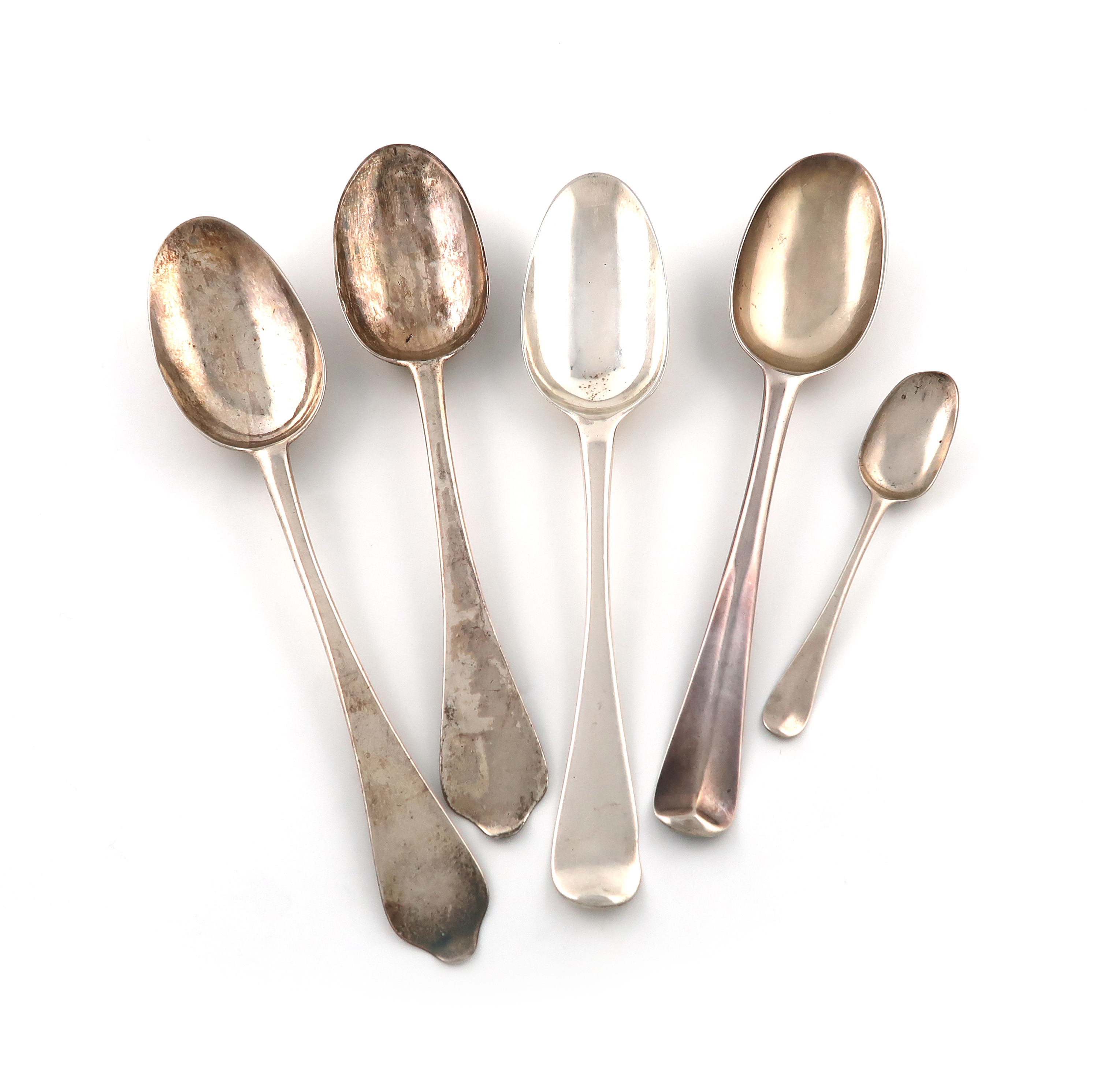 comprising: a George I Irish silver Hanoverian pattern tablespoon, by Esther Forbes, Dublin 1724, the reverse of the terminal with a crest of a double headed bird, plus two Queen Anne Dog-nose tablespoons, London 1707 and 1709, one by Mary Matthew, the reverse of the terminals with scratch initials, plus a Hanoverian pattern tablespoon by Jane Lambe, London 1746, and a Hanoverian pattern teaspoon, by Ann Hill, approx. total weight 7.7oz. (5)
