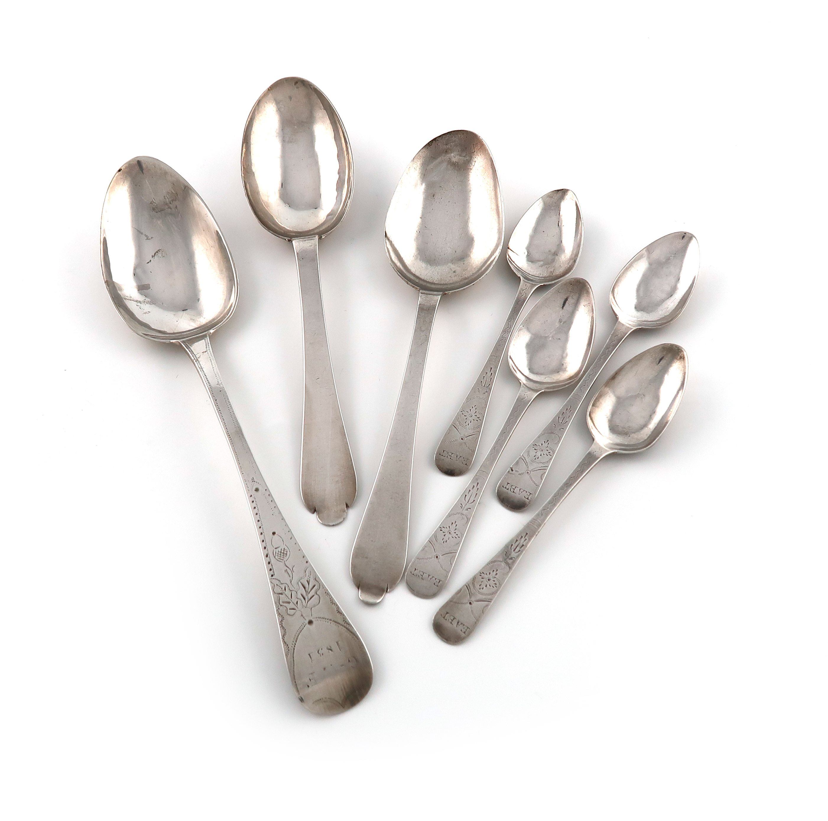comprising: a Trefid spoon by Pierre Amiraux, Jersey, the reverse of the terminal with initials, a Trefid spoon, by L.C, Jersey, circa 1760, a tablespoon by Jacques Quesnel of Jersey, and four teaspoons by John Le Gallais, approx. weight 4.6oz. (7)