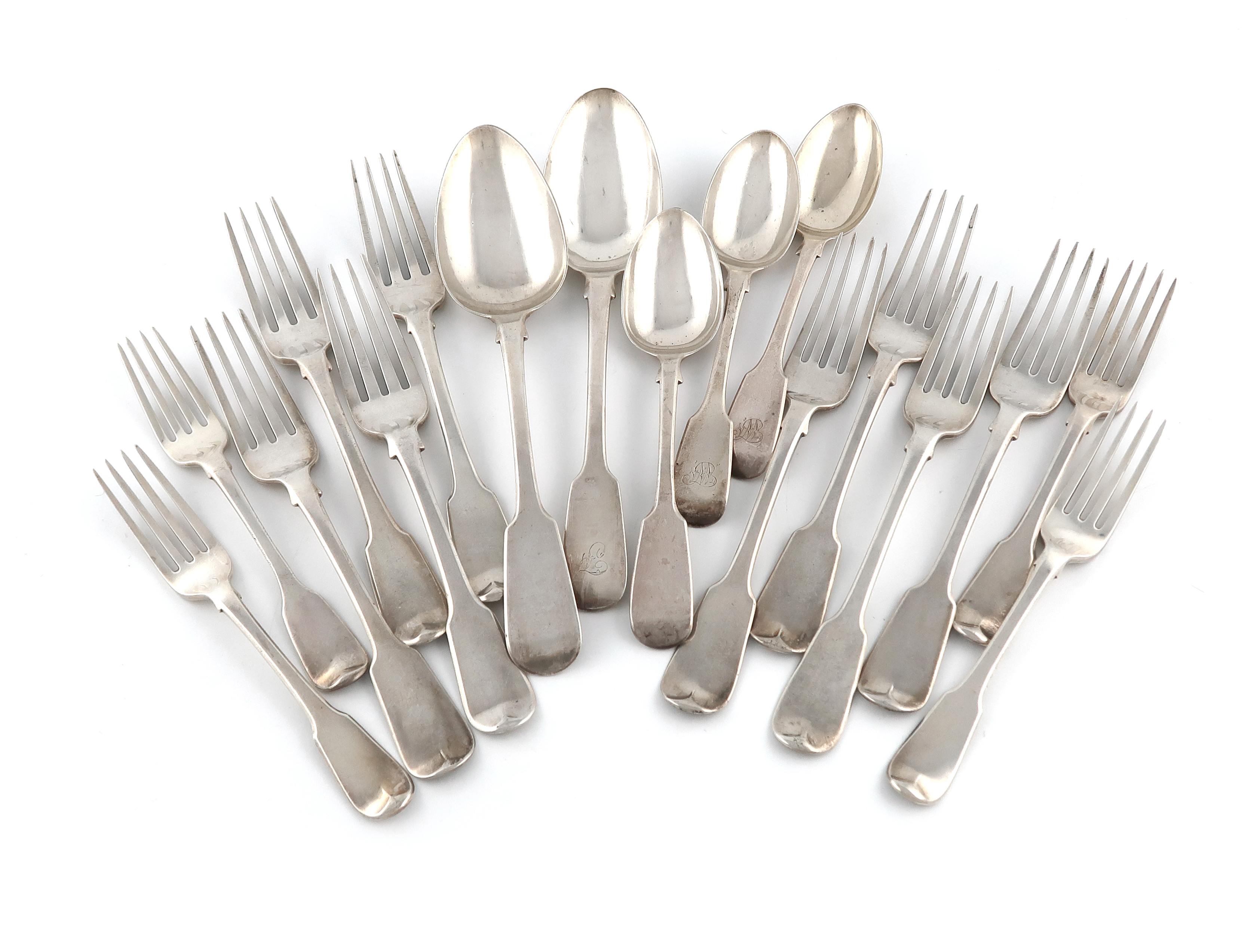the reverse of the terminals with crests and monograms, comprising: eight table forks, four dessert forks, three dessert spoons and a pair of tablespoons, approx. weight 33oz. (qty)