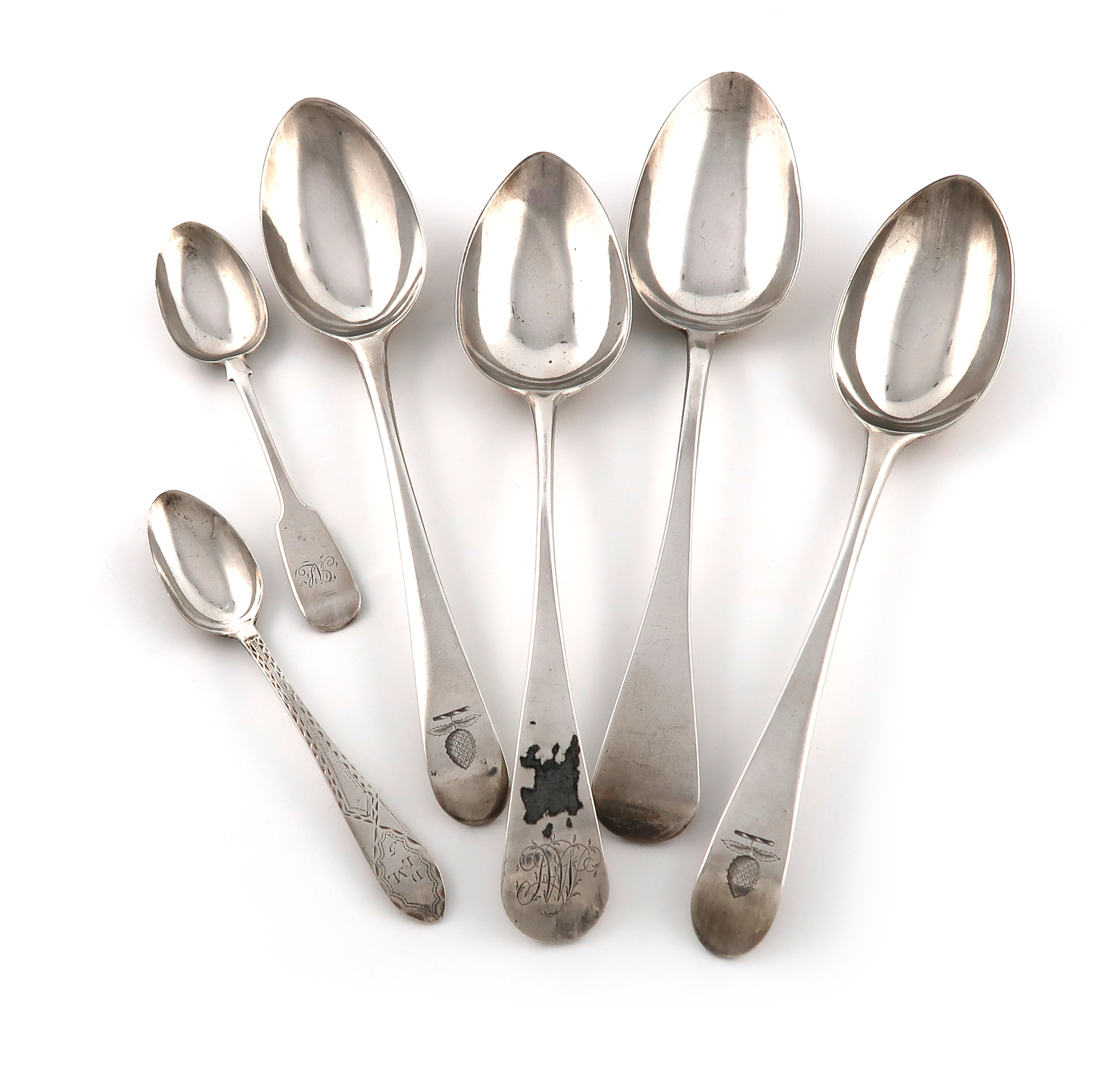 comprising: a pair of George III Old English pattern tablespoons, by Thomas Eustace, Exeter 1785, the terminals with a crest, plus two further tablespoons and two teaspoons, approx. weight 8.8oz. (6)